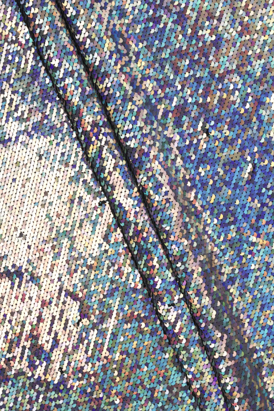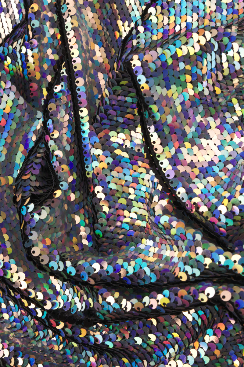 Tessuto da sera italiano - paillettes rivoltate da un lato nere, e paillettes ologramma dall'altro, cucite su un tessuto a maglia elastico.