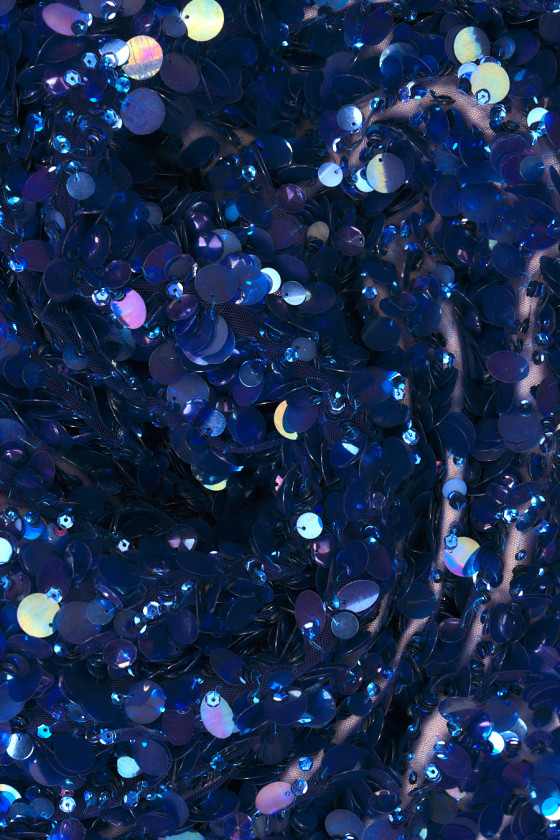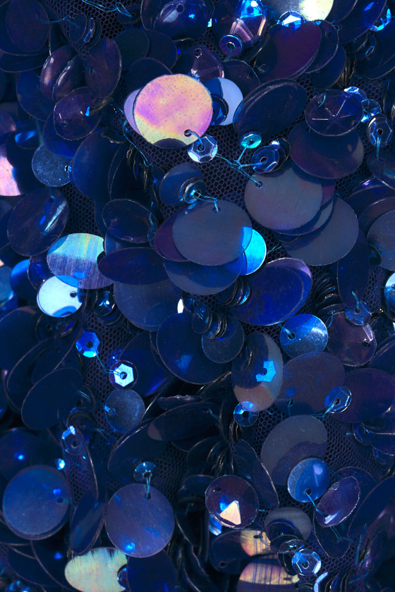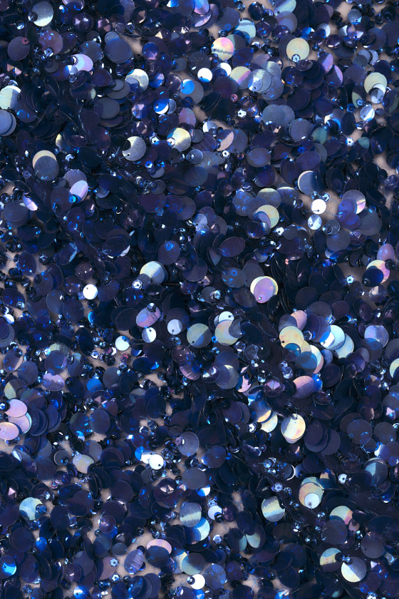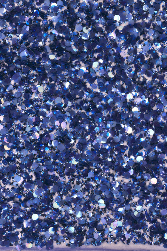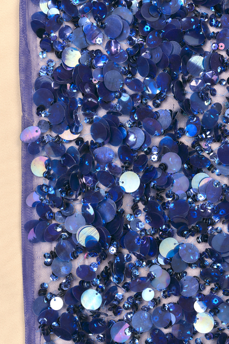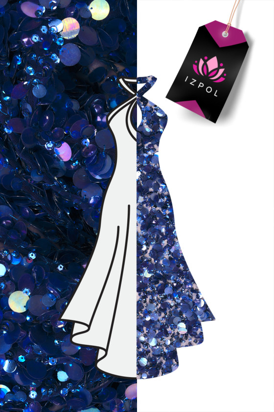 Tulle rigido italiano con occhielli classici blu fiordaliso. E' stato riccamente decorato con grandi paillettes trasparenti in fiordaliso, hanno un diametro di circa 1 cm e paillettes più piccole dello stesso colore. Il tessuto è molto efficace, leggermente trasparente (necessita di fodera), pesante e non elastico. Una proposta fantastica per cucire un abito da sera, una gonna o una camicetta in un'edizione molto interessante.