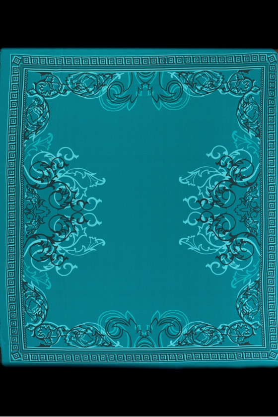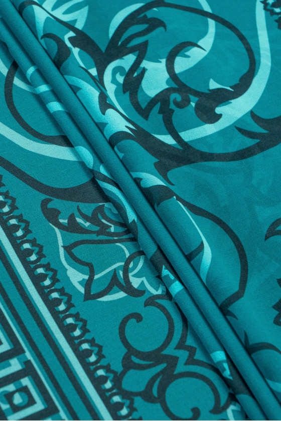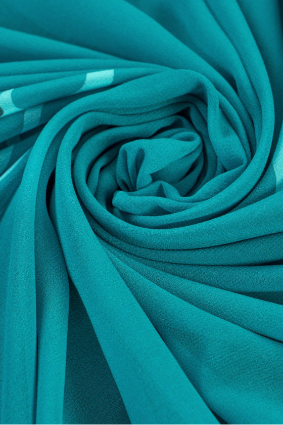 Chiffon di poliestere di un noto stilista. Motivo orientale alla moda in nero su sfondo marino - verde. Viene fornito in un coupon con dimensioni di 120 cm*145 cm.