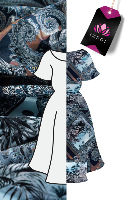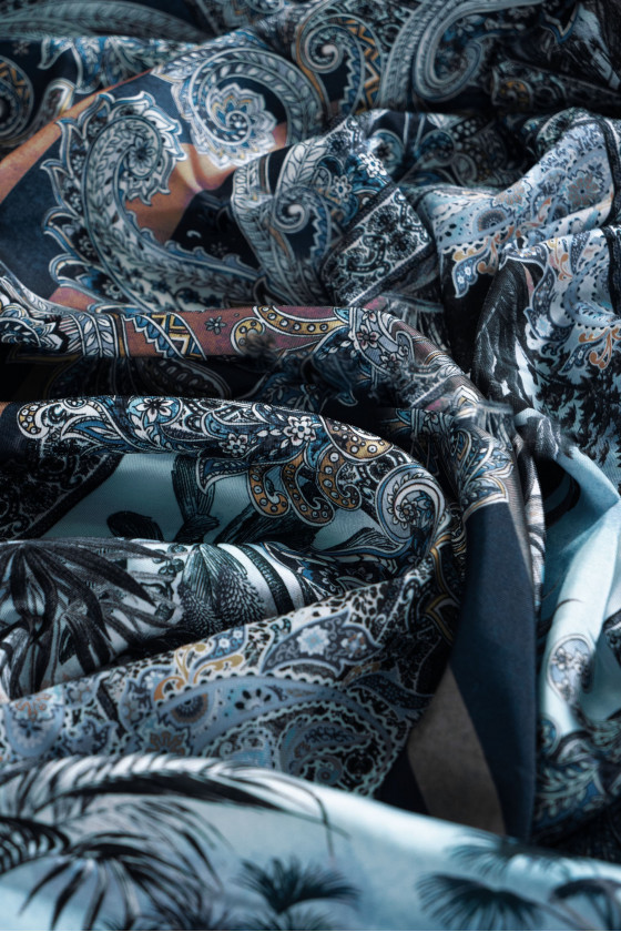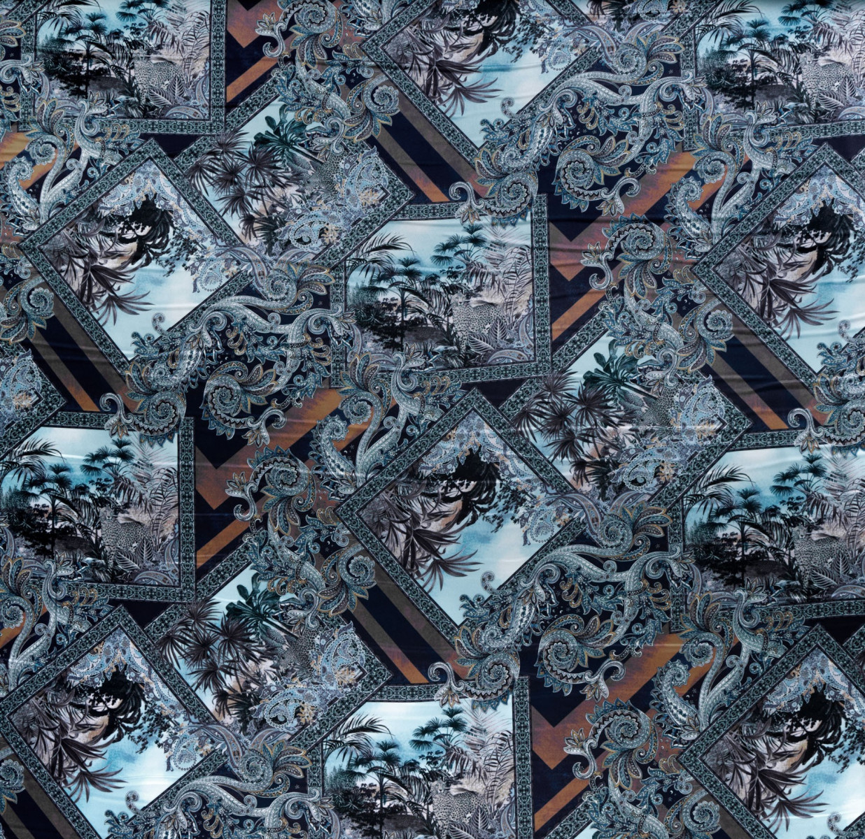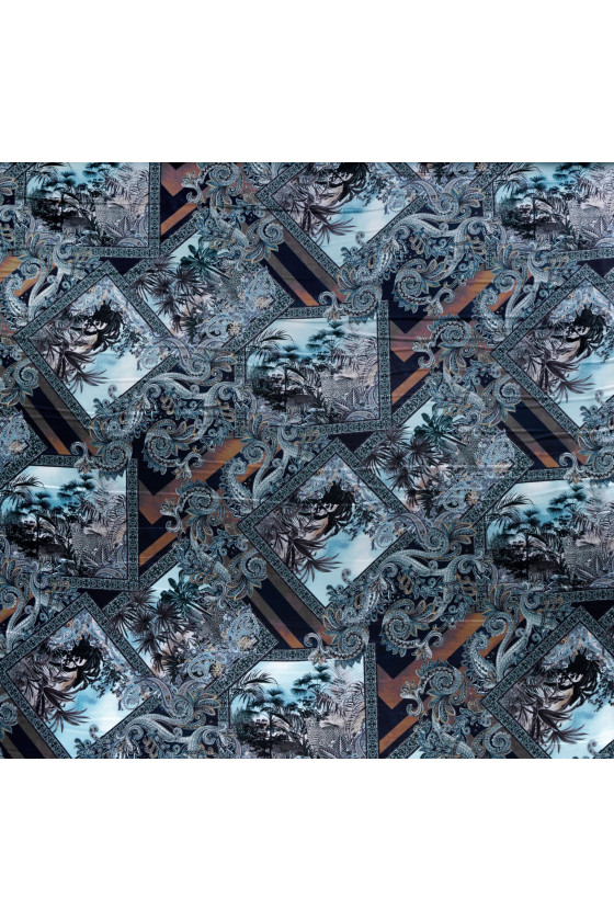 Tessuto twill di poliestere italiano con motivi orientali nei toni del blu navy e del marrone. Il twill è un tessuto con una trama a saia, morbido, molto resistente, delicatamente rigido da adattare. Perfetto per cucire una camicia, un vestito, una gonna o uno scialle/sciarpa.