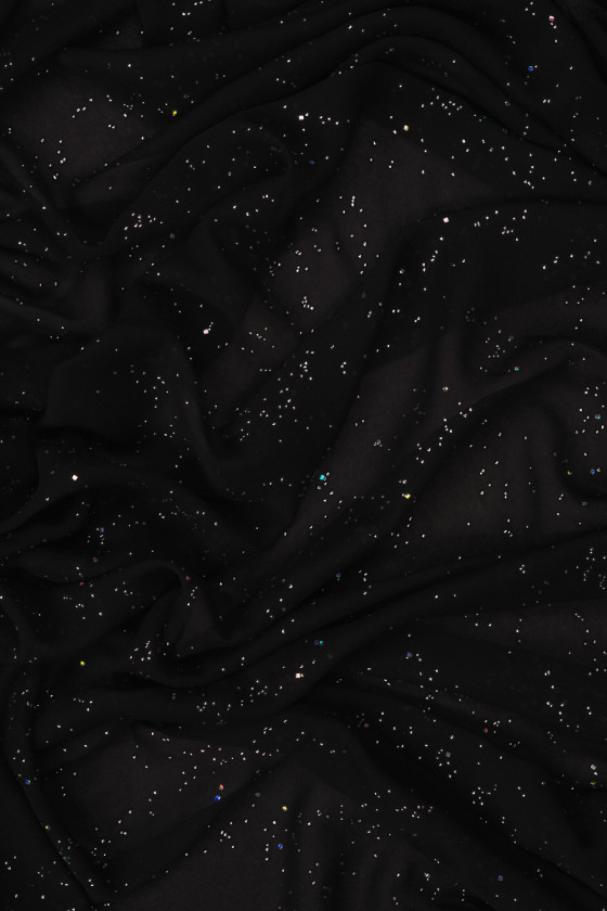 Chiffon di poliestere italiano di colore nero con piccole decorazioni colorate.