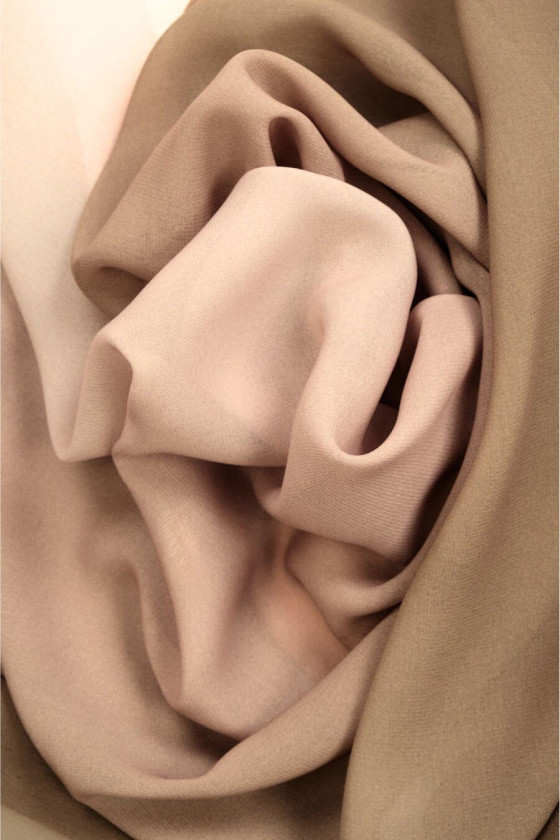 Chiffon di poliestere ombre nei toni del beige e del marrone. Il motivo va dal beige su un bordo del tessuto, attraverso le sfumature dell'albicocca e del beige fino al marrone sull'altro bordo - si consiglia di cucire circonferenzialmente. Il tessuto è molto avvolto, leggero, scorrevole, leggermente trasparente e non elastico. Un'ottima proposta nei colori autunnali, che funzionerà bene per cucire un vestito, una gonna, una tunica o una camicia.