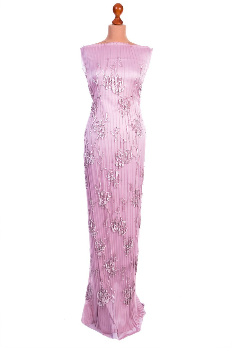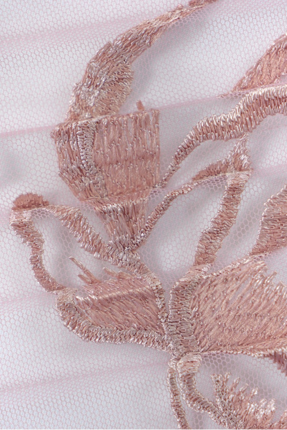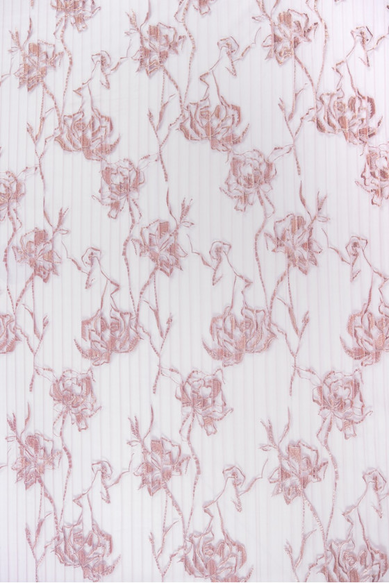 Tulle plissettato italiano con fiori ricamati in rosa sporco. La larghezza della tenda plissettata è di 1,5 cm. Il tessuto è cucito circonferenzialmente.