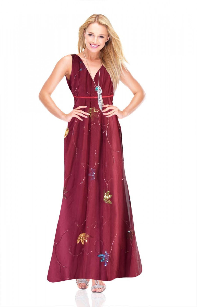 Tessuto italiano in tulle bordeaux con fiori ricamati composto da paillettes colorate e perline. Una proposta originale per cucire una camicetta o un vestito da sera.