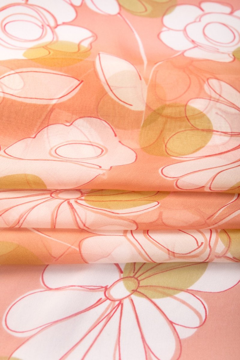 Mussola di seta salmone con cerchi di pistacchio del diametro di 4,5 cm e motivo sagomato di fiori con centro crema. La mussola è semitrasparente, molto delicata al tatto, splendidamente drappeggiata, ha una lucentezza delicata e nobile. Lo consigliamo per cucire abiti, tuniche, gonne ariose.