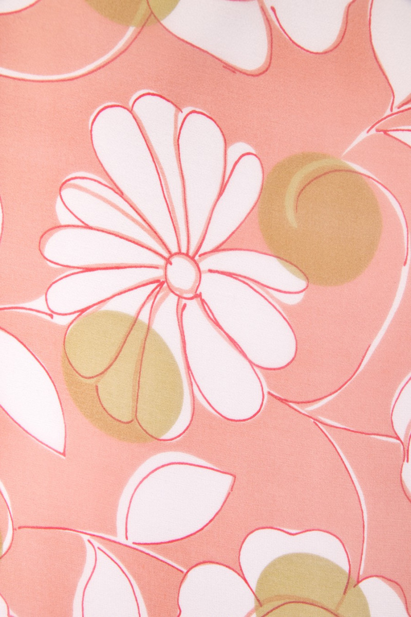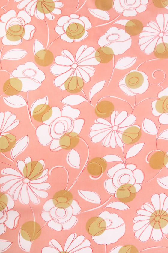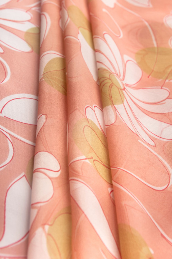 Mussola di seta salmone con cerchi di pistacchio del diametro di 4,5 cm e motivo sagomato di fiori con centro crema. La mussola è semitrasparente, molto delicata al tatto, splendidamente drappeggiata, ha una lucentezza delicata e nobile.