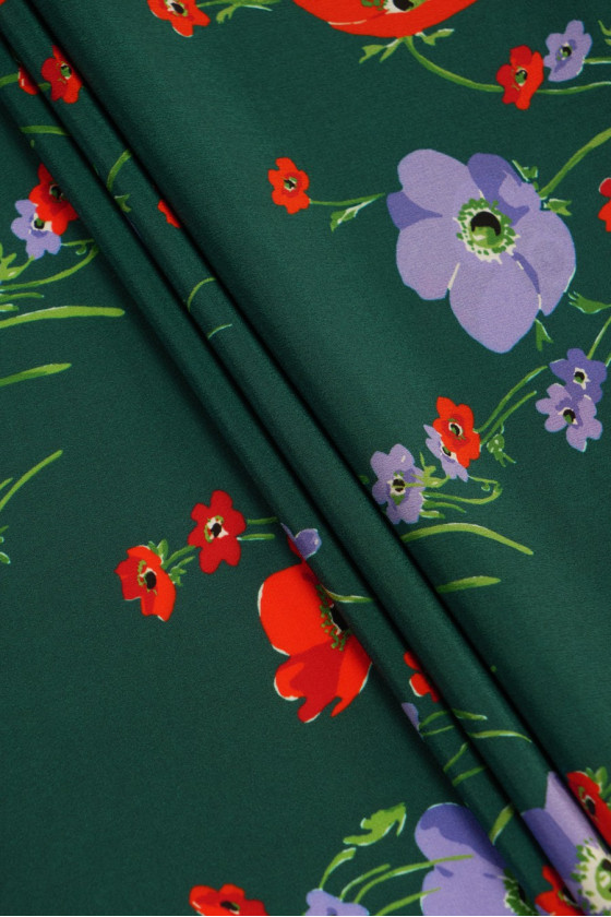 Crepe di seta italiana con motivo di mazzi di fiori nei colori arancio ed erica, su fondo verde bottiglia. Il crêpe di seta è un tessuto delicato, sottile, semi-opaco. Può essere utilizzato per evocare abiti ariosi, camicette delicate, sciarpe, sciarpe.