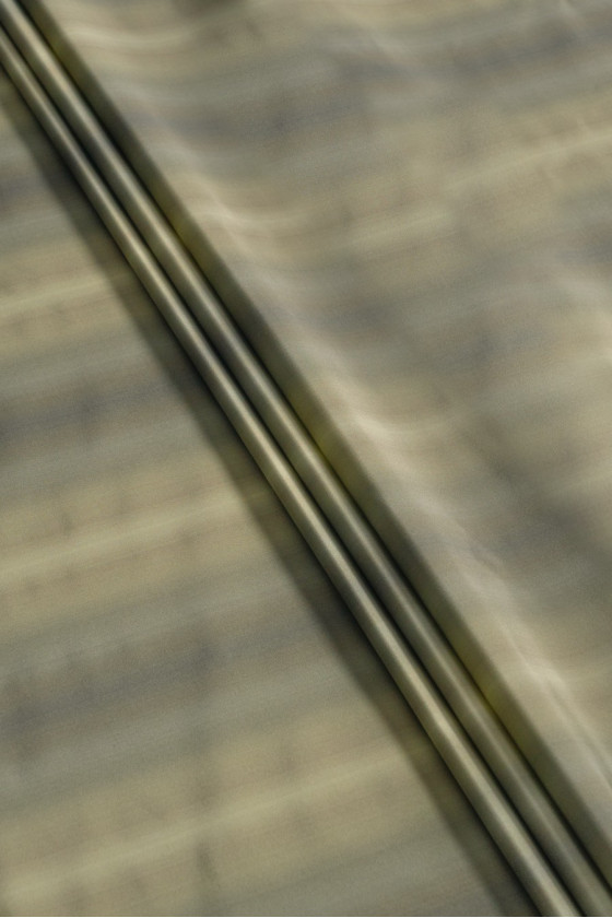Taffetà italiano 100% seta con un interessante motivo di righe sfocate nei colori beige e oliva.