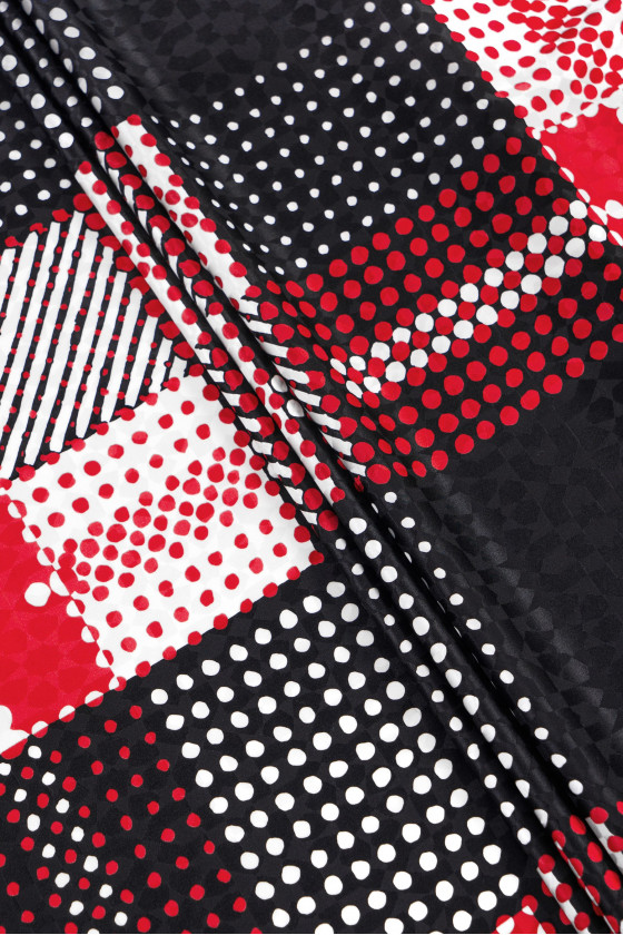 Tessuto italiano 100% seta con trama jacquard, motivi geometrici nei colori: nero, rosso e panna. Tessuto leggero, morbido e fluido: perfetto per cucire una camicia, un vestito, una gonna ariosa, una camicetta o uno scialle.