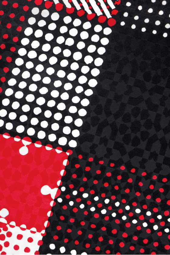 Tessuto italiano 100% seta con trama jacquard, motivi geometrici nei colori: nero, rosso e panna.