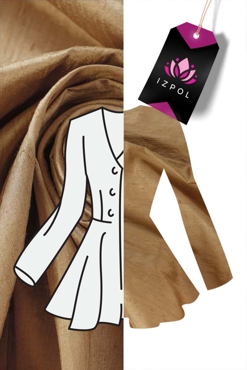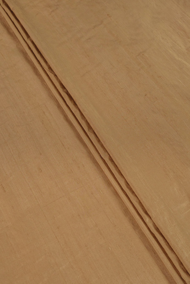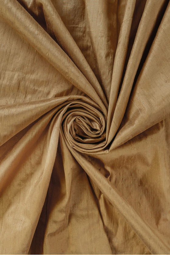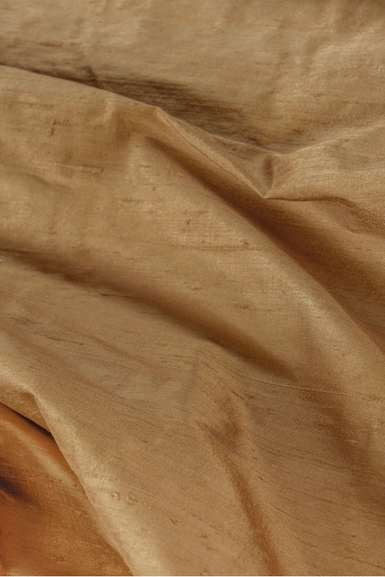 Tessuto italiano 100% shantung di seta color beige dorato. Lo shandung è un tipo di tessuto di seta morbida realizzato con filato grezzo, con caratteristici ispessimenti grumosi distribuiti in modo irregolare (filato filettato ornamentalmente) nella trama. Ha una struttura in plastica leggermente rigida.