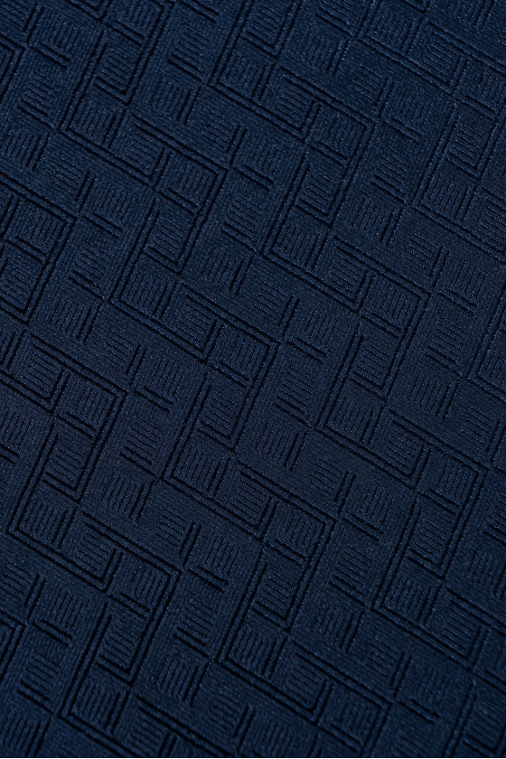 Tessuto italiano 100% seta di colore blu navy, tessuto a trama jacquard con motivo geometrico - rombi. Un tessuto non elastico, sottile, leggermente trasparente, leggero con una lucentezza caratteristica dei tessuti di seta.