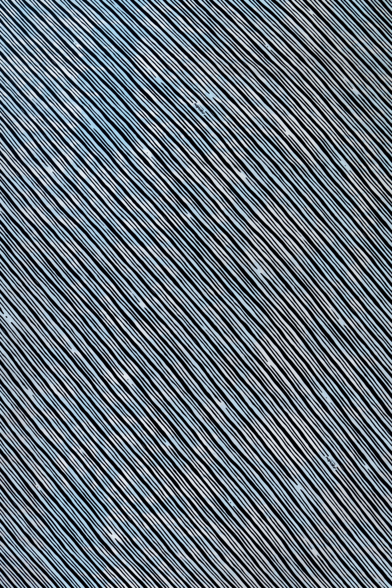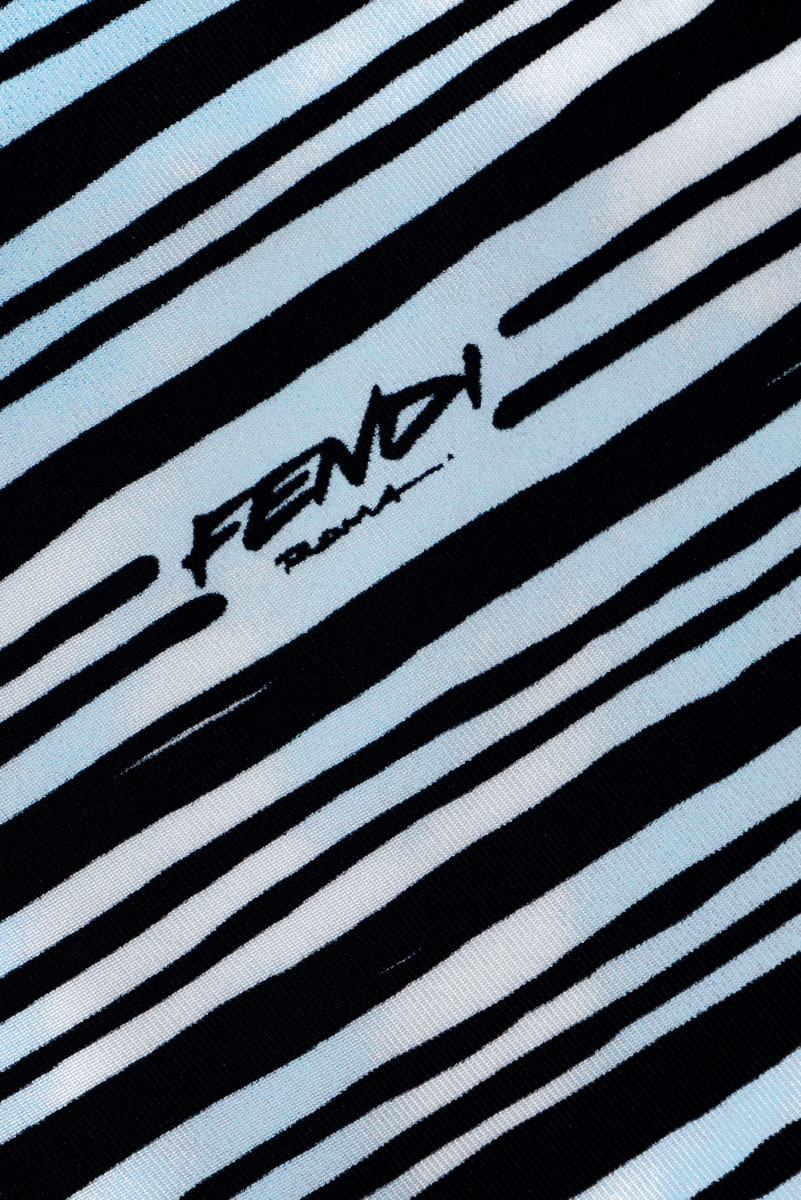 Tessuto twill italiano 100% seta a righe trasversali nere su fondo sfumato in blu e panna. Il tessuto è firmato con il nome di una nota casa di moda.