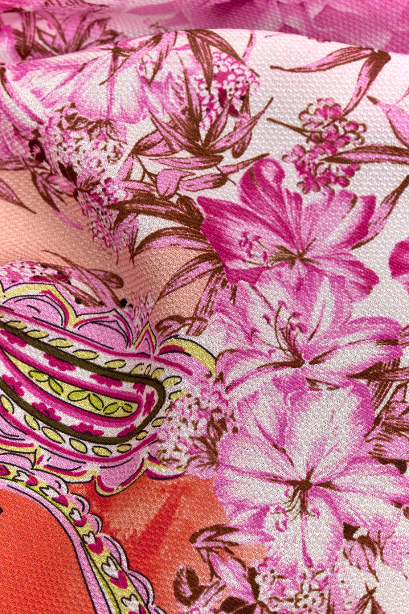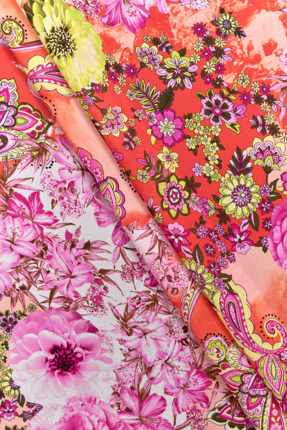Tessuto italiano 100% seta con trama jacquard molto delicata. Un ricco motivo floreale completato da motivi paisley, tutti in arancione, rosa e lime. Il tessuto è molto leggero, non elastico, morbido, leggermente trasparente. È perfetto per abiti estivi come abiti, gonne, camicette o parei.