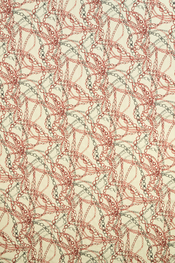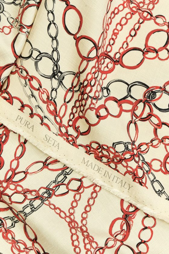 Tessuto italiano 100% seta con motivo di catene rosse e acciaio su fondo ecrù. Il tessuto è leggero, sottile ma opaco, anelastico, un po' rigido da adattare, con una struttura che ricorda una trama di lino. Un'ottima proposta da cui puoi creare camicie, pantaloncini, camicetta o vestito.