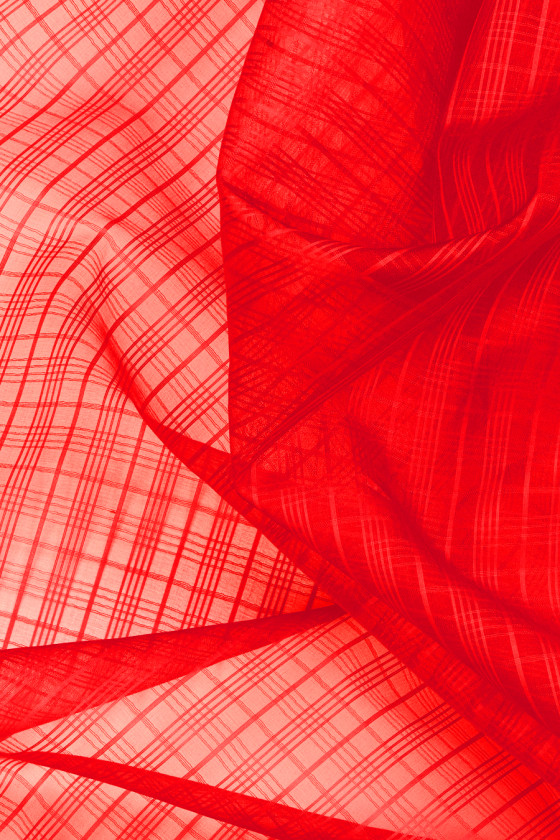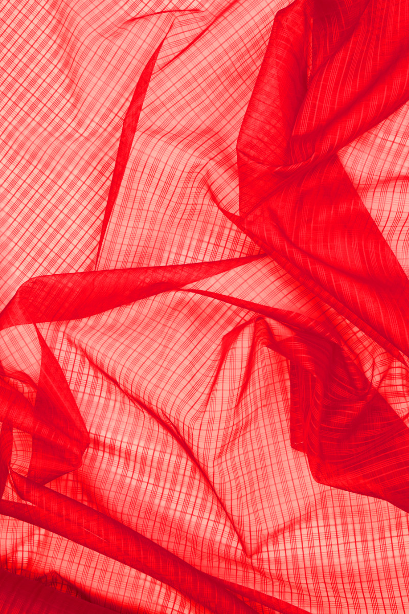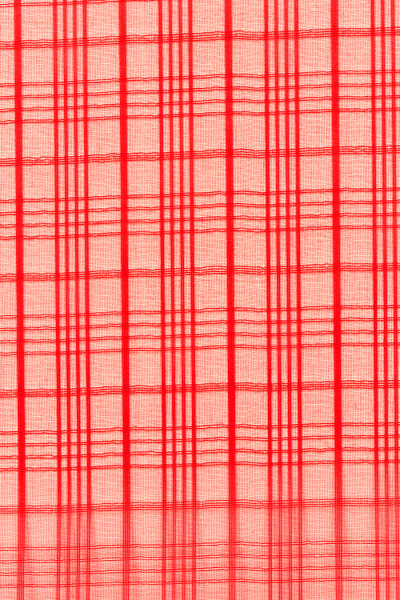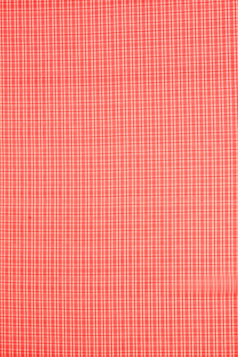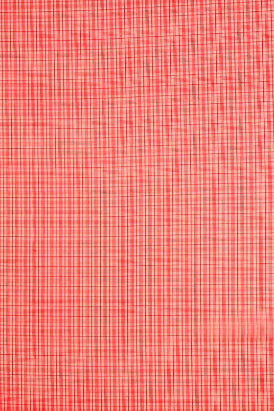 Organza italiana 100% seta rossa con motivo a righe regolarmente posizionate che formano un motivo a scacchi che si ripete ogni 2,5 cm. Il tessuto è trasparente, leggermente rigido e non elastico. Tessuto destinato ad abiti, camicette, camicie, gonne.