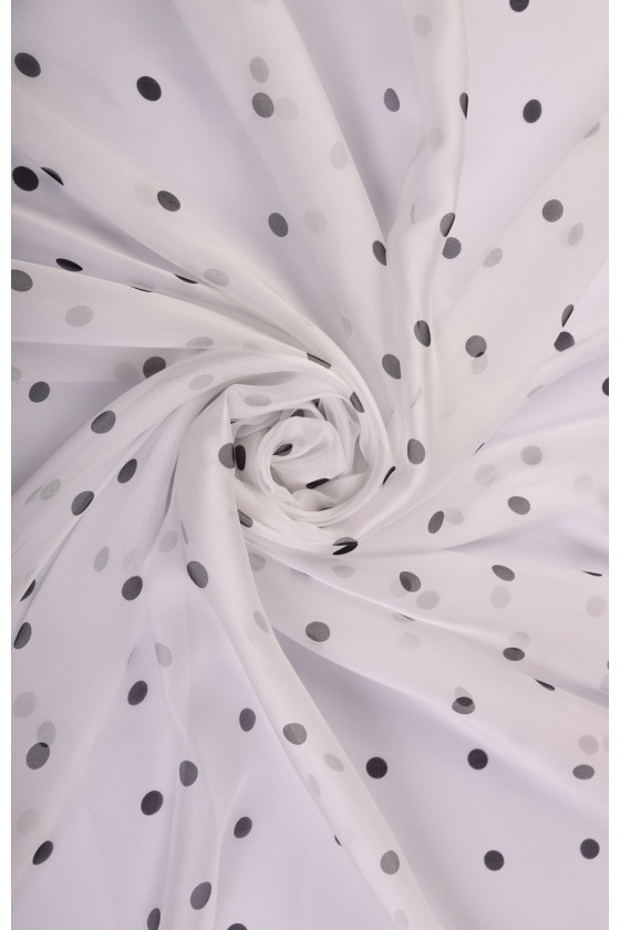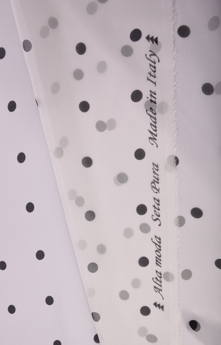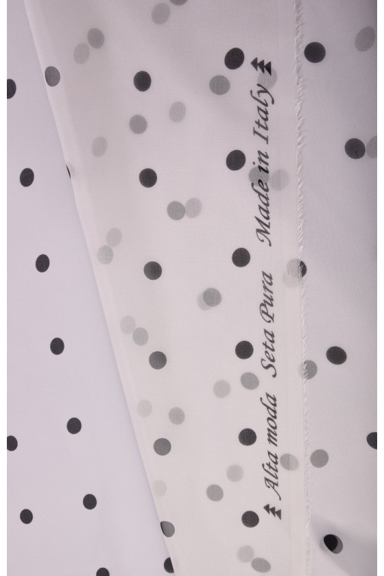 Lo chiffon di seta è un tessuto molto delicato, arioso e trasparente. Perfetto per abiti ariosi e camicette. Tessuto non elastico. Colori: pois neri su fondo ecrù
