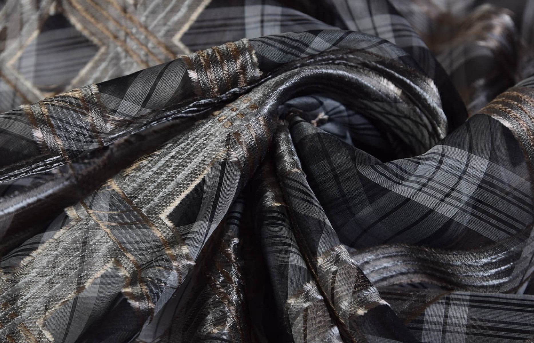 Tessuto in organza con un motivo a quadri alla moda, tessuto in viscosa e seta. Una bella e classica combinazione di colori: beige, nero e grigio. La sua struttura è leggermente rigida, traslucida. Si consiglia di cucire gonne, abiti, camicie formali o di utilizzarlo come tessuto decorativo.