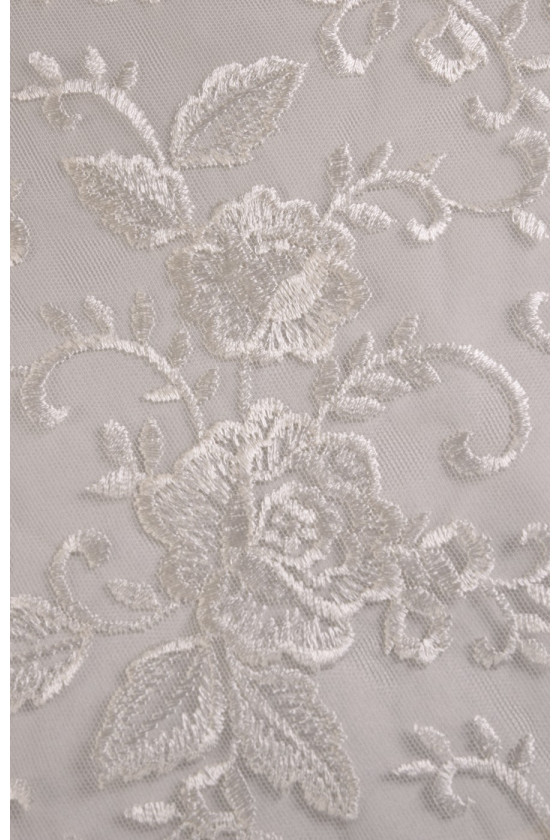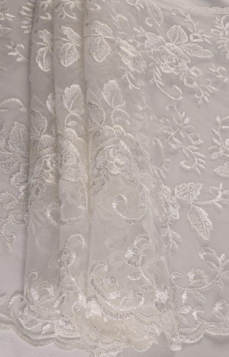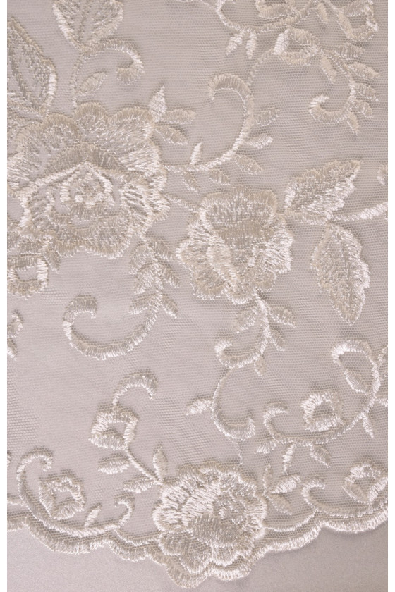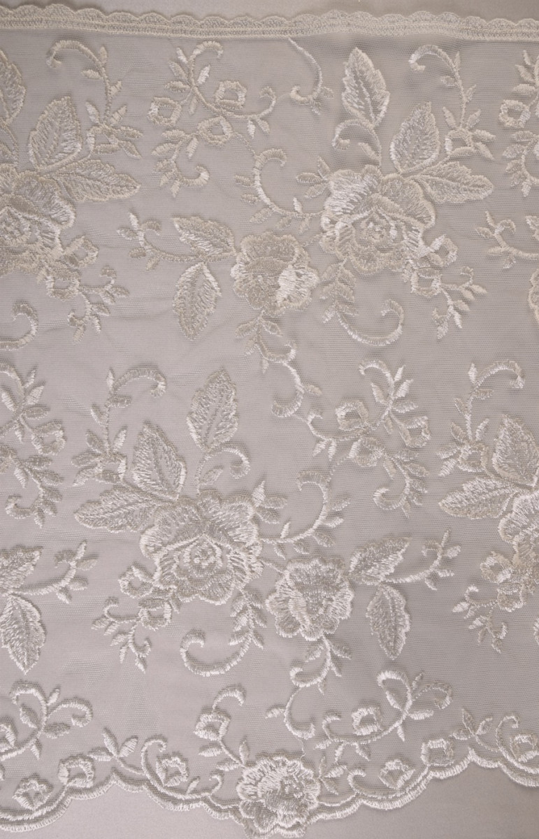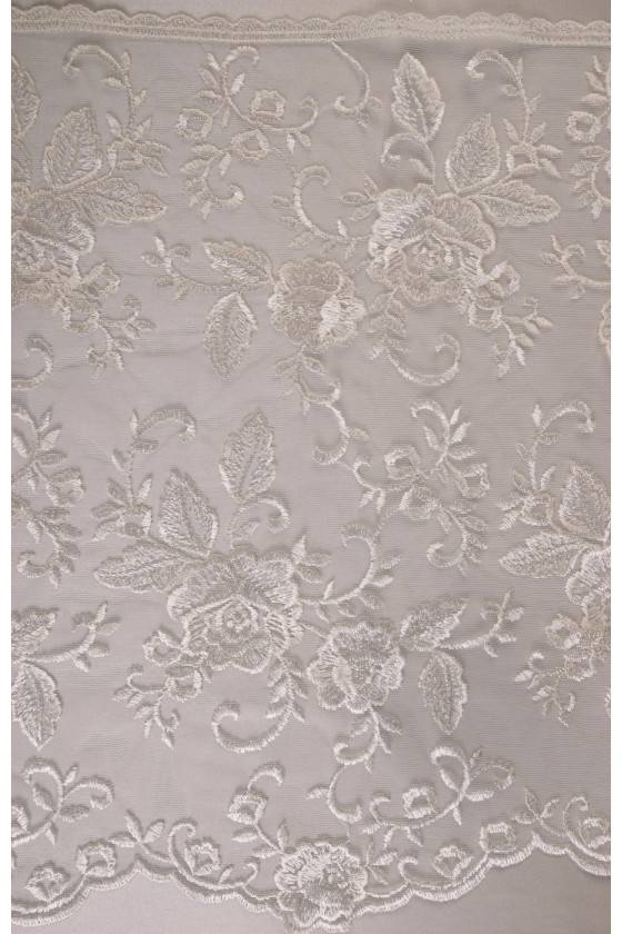 Pizzo ecrù ricamato con fantasia floreale. La corona è larga 35 cm ed è rifinita con un dente decorativo su entrambi i lati. Tessuto morbido al tatto. Lo consigliamo per rifinire eleganti abiti formali e da sposa.