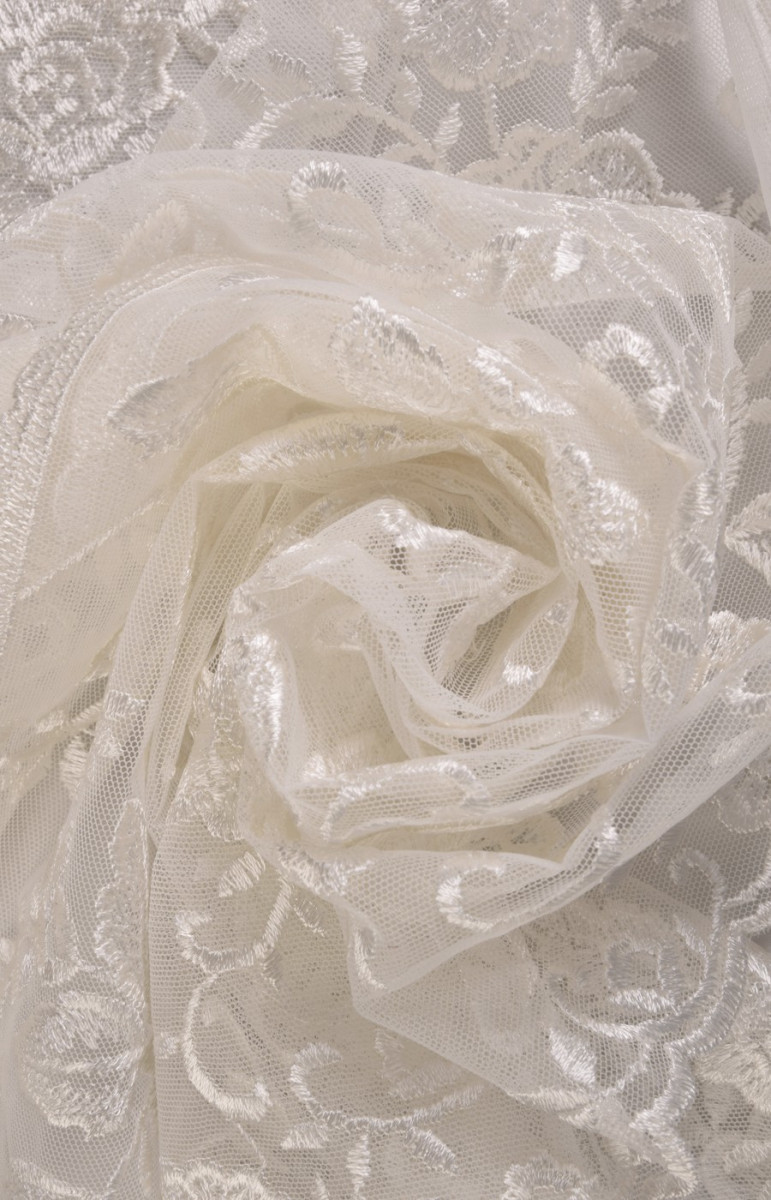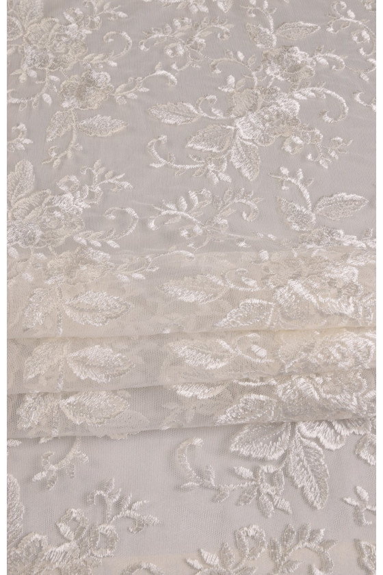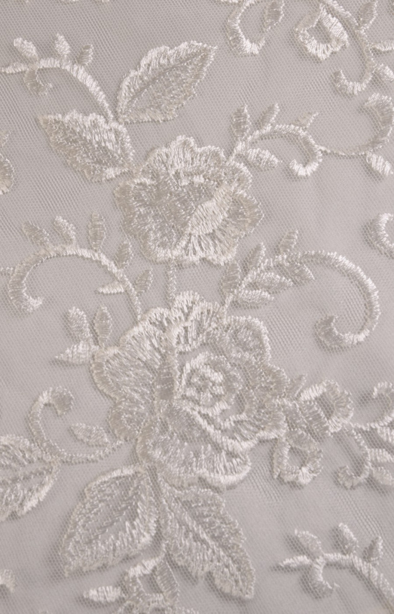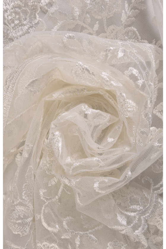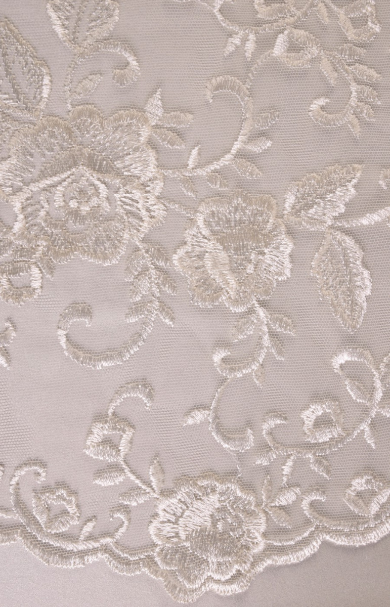Pizzo ecrù ricamato con fantasia floreale. La corona è larga 35 cm ed è rifinita con un dente decorativo su entrambi i lati. Tessuto morbido al tatto. Lo consigliamo per rifinire eleganti abiti formali e da sposa.