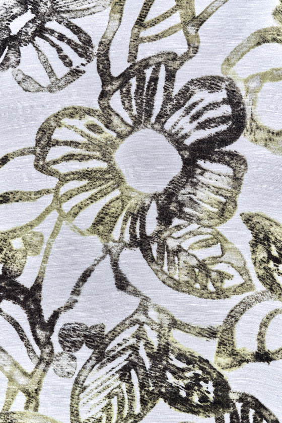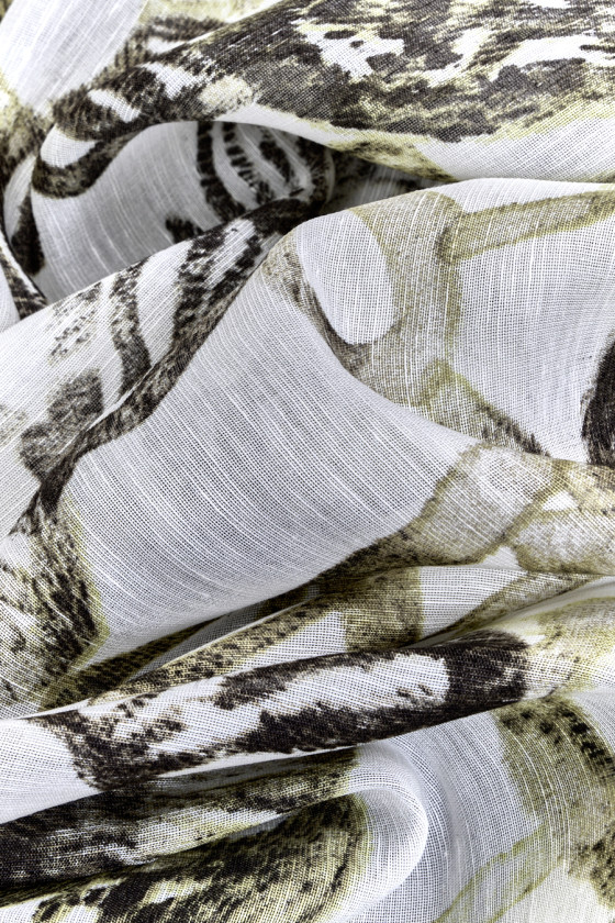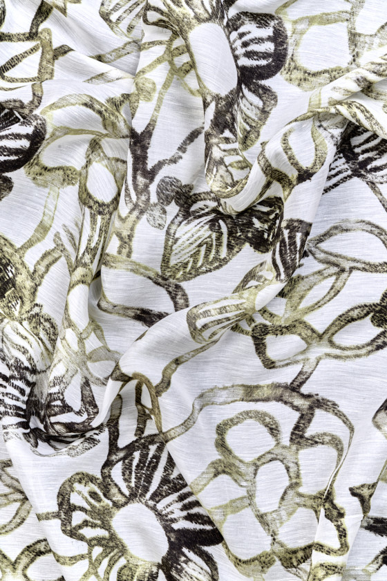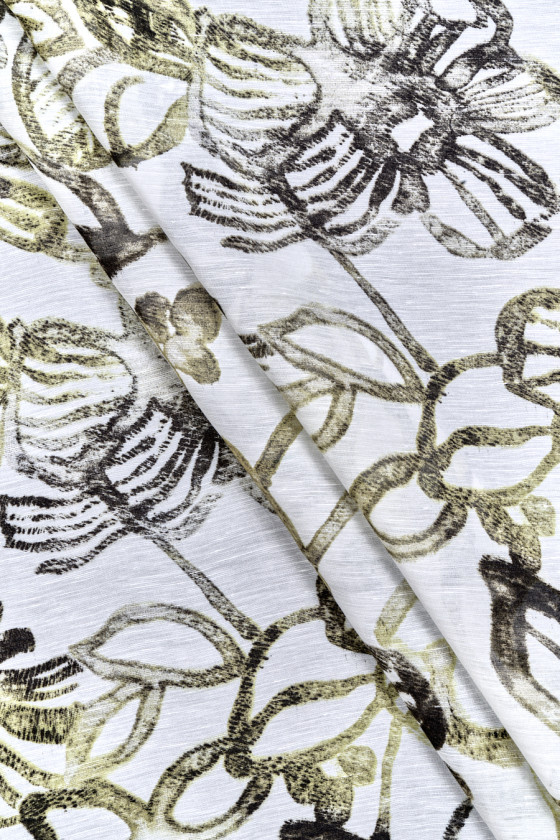 Tessuto italiano 100% lino con fiori verdi e olivastri su fondo panna. Motivo denso e ampio che mostra i contorni di fiori e foglie. Il tessuto è sottile, leggermente trasparente, non elastico e leggermente rigido. Una proposta unica in colori tenui, perfetta per l'abbigliamento estivo.