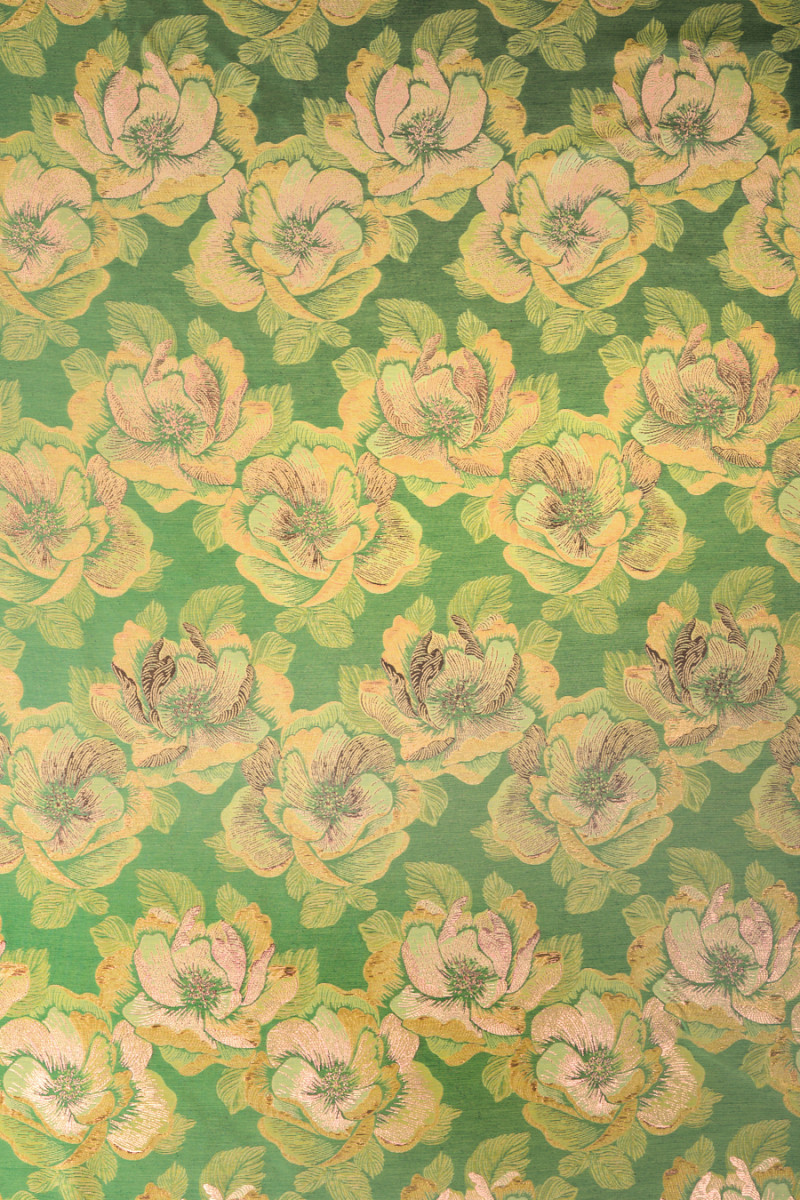 Tessuto jacquard italiano per costumi di colore verde con motivo di grandi fiori gialli e verdi rifiniti con filo di rame. Il tessuto è leggermente cangiante, sottile e morbido, ma opaco. Fiori densamente disposti che misurano 22 cm * 22 cm. Una proposta ideale per cucire un vestito fenomenale, una gonna, un cappotto leggero.