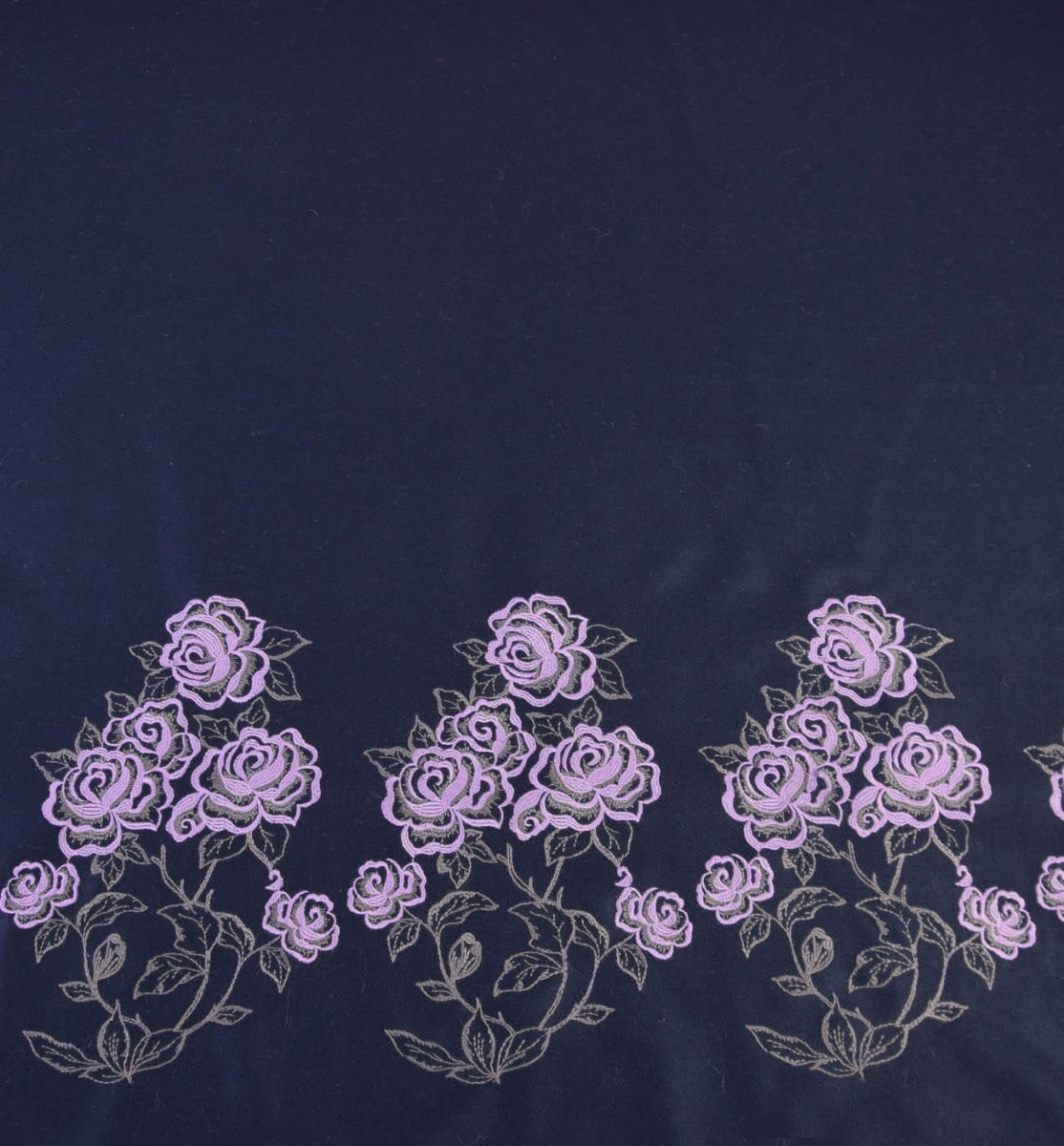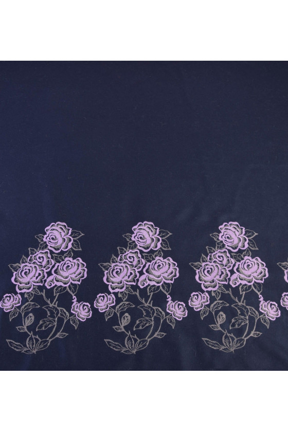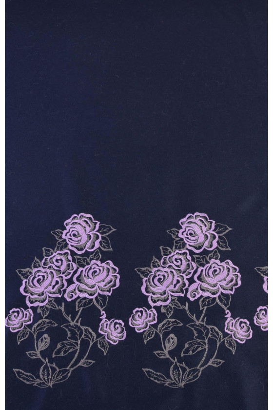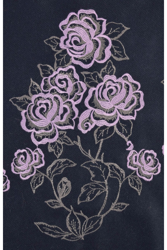 Tessuto cappotto italiano 100% lana di colore blu navy, lungo un bordo è presente una striscia floreale ricamata melange-oliva, larga circa 47 cm - il tessuto è cucito circonferenzialmente.