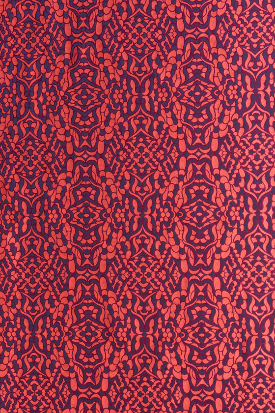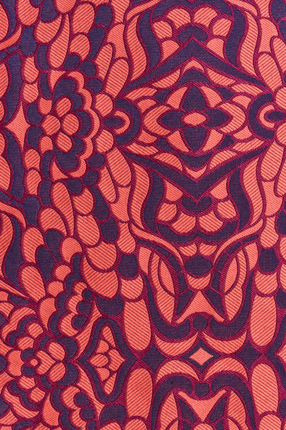 Tessuto jacquard italiano per costumi con fantasie in blu navy scuro e arancione con bordi bordeaux. Il tessuto è carnoso, anelastico, leggermente rigido. Una proposta interessante per cucire una giacca o un vestito unico.