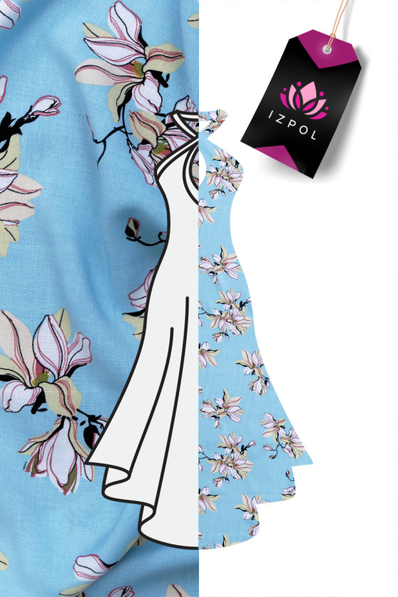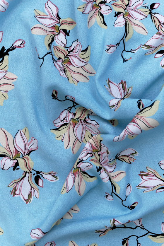 Tessuto italiano 100% viscosa di colore blu con un fitto motivo floreale. I fiori hanno dimensioni variabili da 10 cm a 15 cm e sono di colore écru, beige, nero con bordi bordeaux. Il tessuto è sottile, non elastico con una trama a tela. Una proposta molto sottile per cucire un vestito estivo, una camicetta o una gonna.