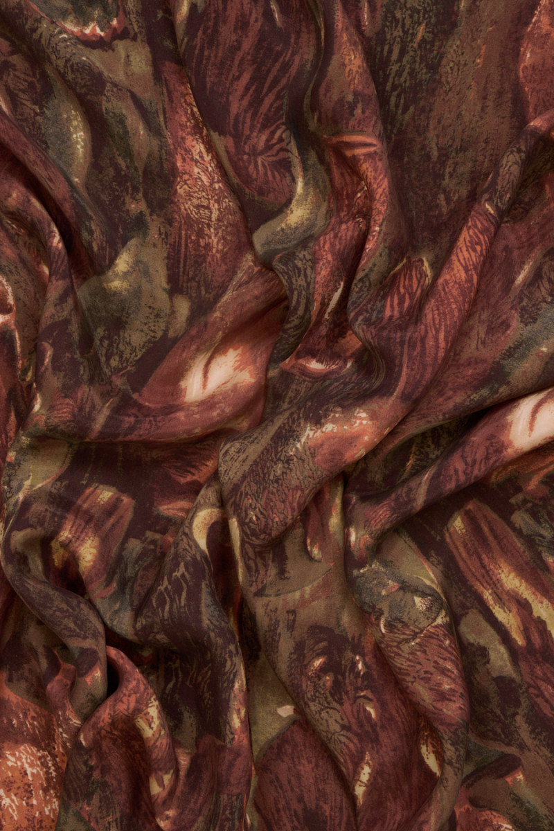Tessuto italiano 100% viscosa con motivo di vegetazione sfocata nei colori marrone e verde oliva. Il tessuto è fluido, leggero, molto piacevole al tatto, opaco e lavora delicatamente sui fili. È perfetto per cucire una camicetta, una gonna e un vestito.
