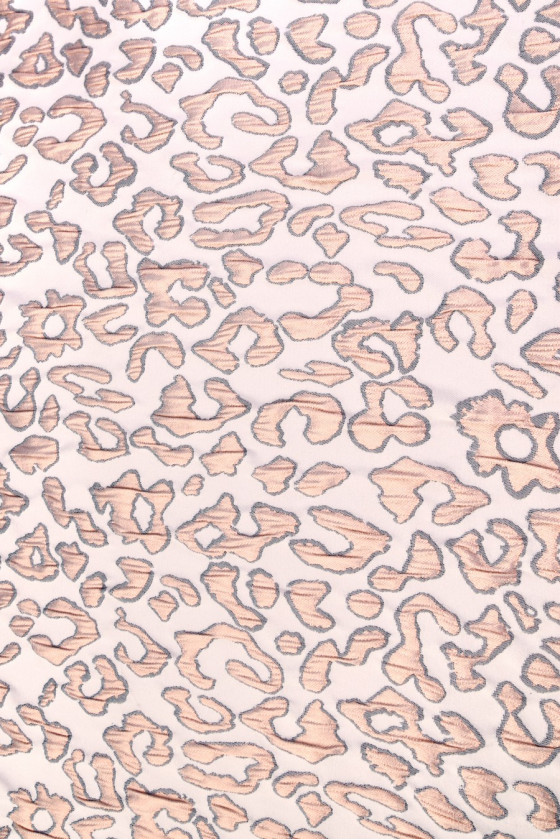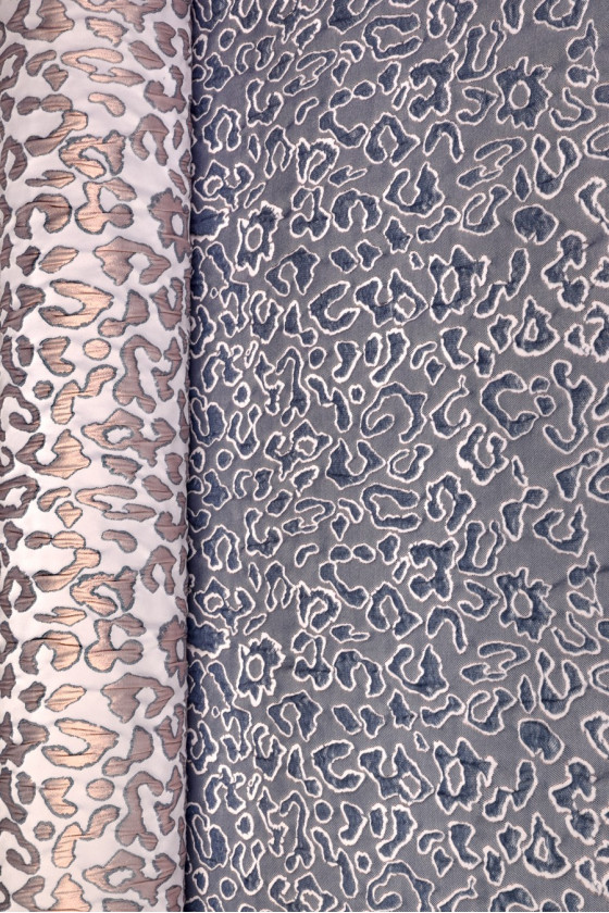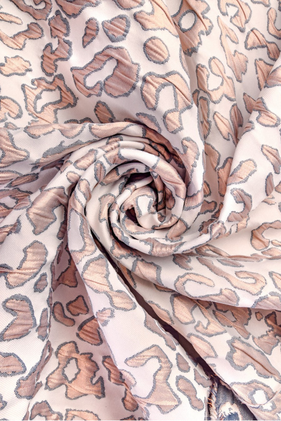 tessuto jacquard italiano costumi bianco crema. Il materiale ha un motivo molto interessante che ricorda la stampa leopardata con una dimensione di circa 4 cm. Il motivo animale è realizzato in filo lucido color rame e ha inoltre un bordo blu navy. Il tessuto è molto efficace, ha una struttura leggermente ondulata, che gli conferisce "morbidezza". La sua straordinaria malleabilità e rigidità lo rendono ideale per cucire abiti con costruzione.