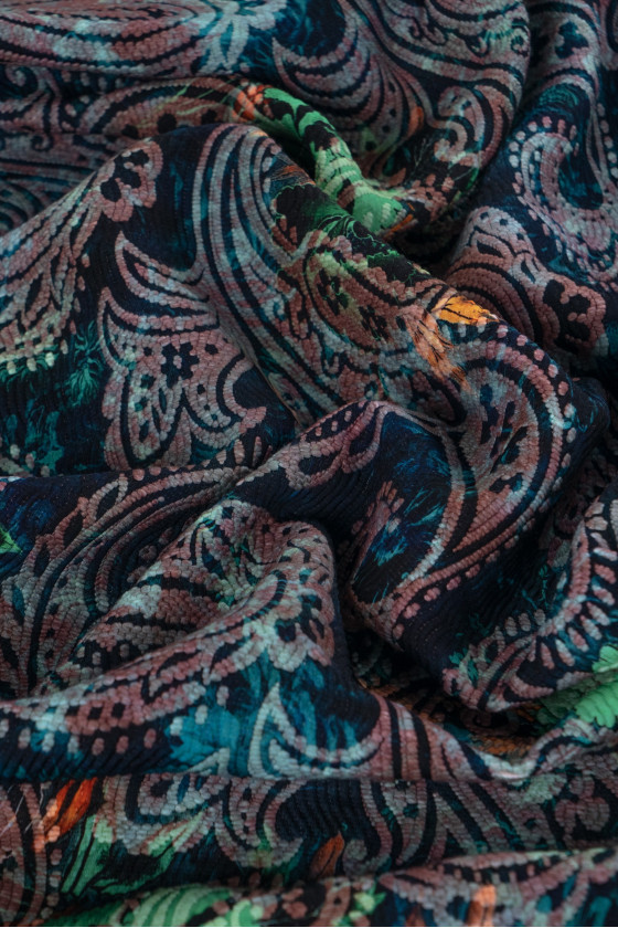 Tessuto italiano in lana jacquard - double-face. Da un lato con un motivo paisley pastello su sfondo blu navy e verde acqua in foglie, e dall'altro con un motivo paisley crema su sfondo beige e rosa. Il tessuto è più spesso, rigido, non elastico.