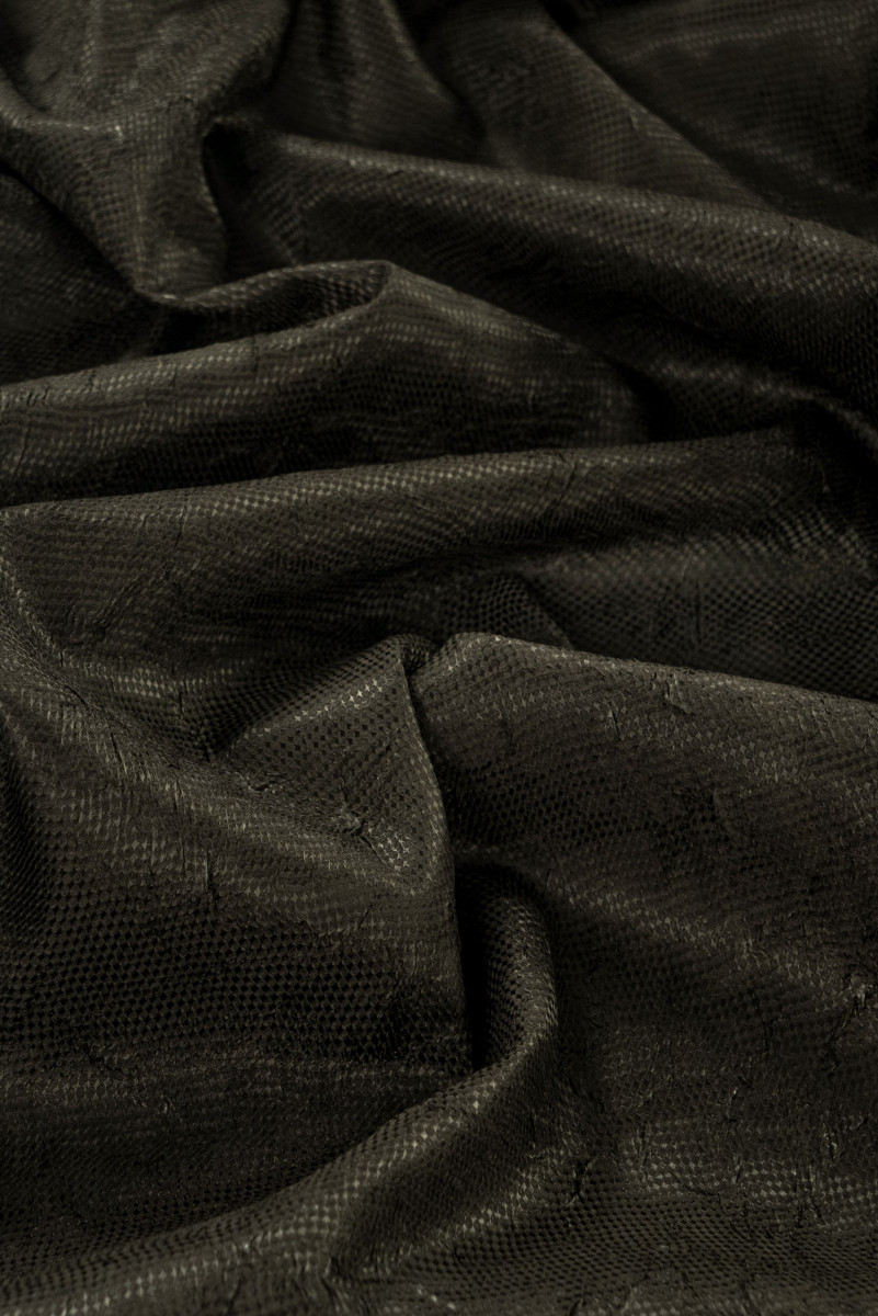 tessuto jacquard italiano costumi verde marcio. Tessuto sottile, rigido, elastico con un'interessante struttura stropicciata. Perfetto per cucire un vestito, una camicetta, una gonna o per scopi decorativi.