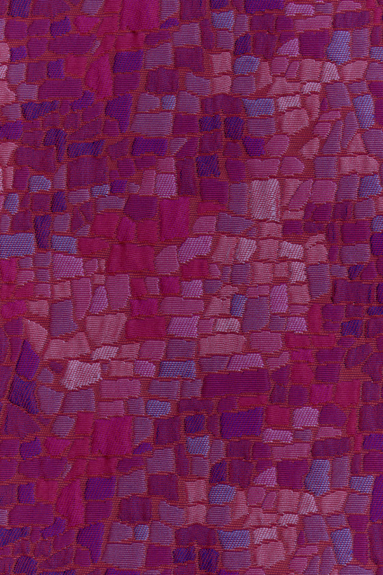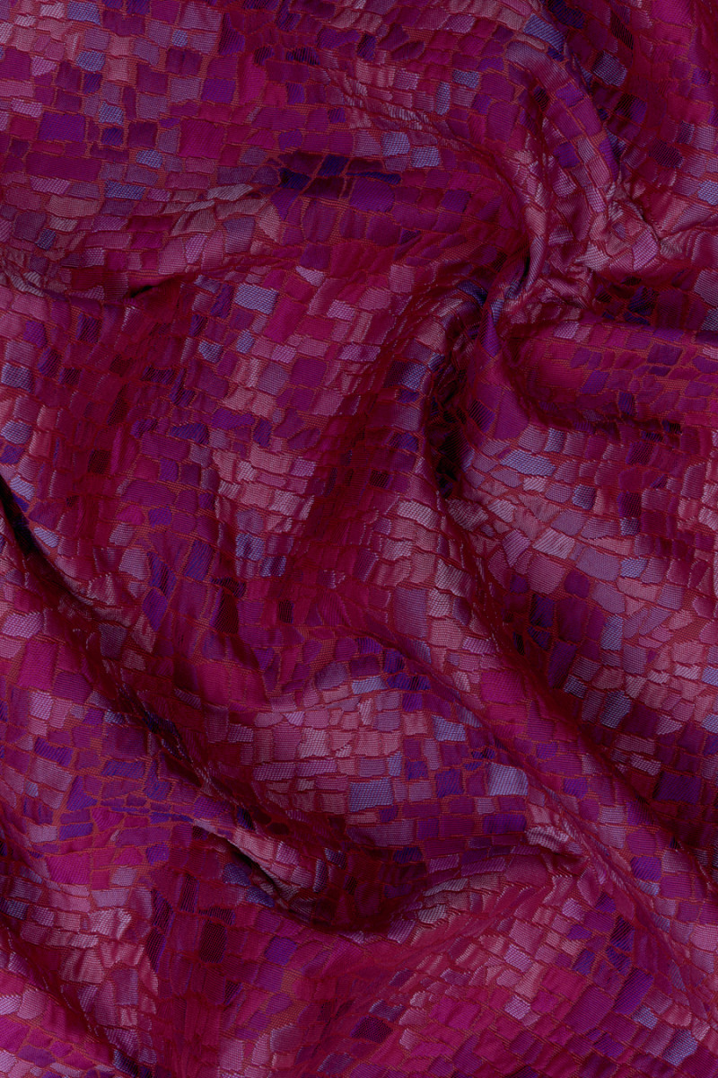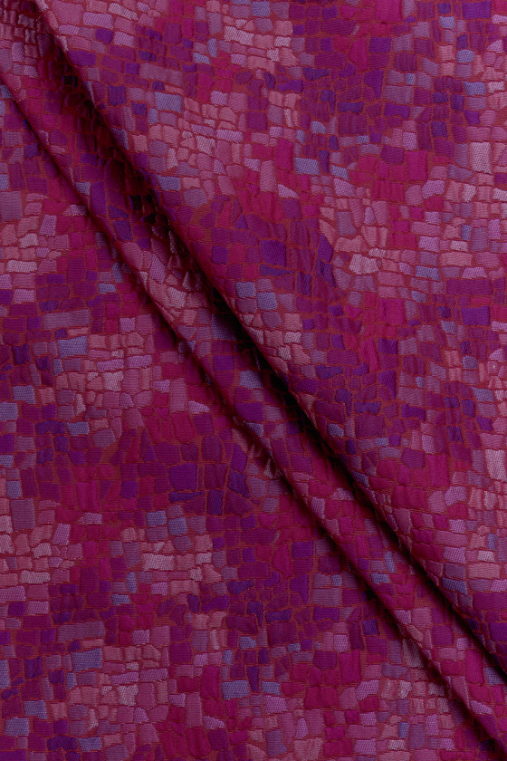 Tessuto jacquard italiano per costumi con piccoli quadrati fittamente disposti di forme irregolari, nei colori rosa, fucsia e viola. Un motivo leggermente in rilievo realizzato su sfondo rosso. Il tessuto è morbido, opaco, non elastico.