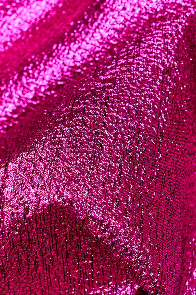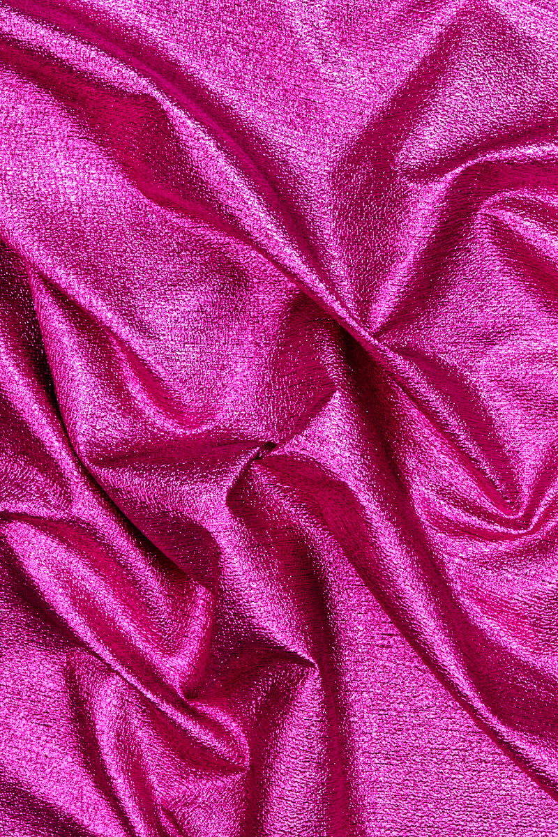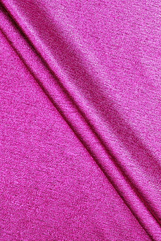 tessuto jacquard italiano per costumi fucsia e nero con filo metallico. Un tessuto di medio spessore, non elastico, rigido, splendidamente lucido. È perfetto per gli outfit da sera.