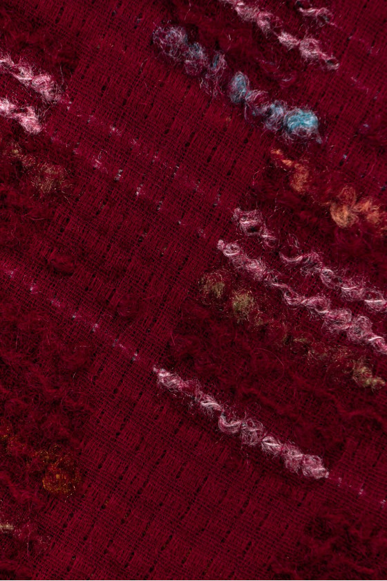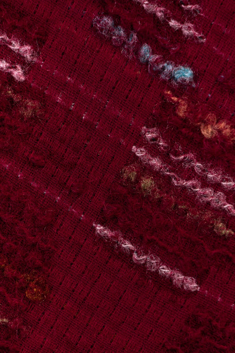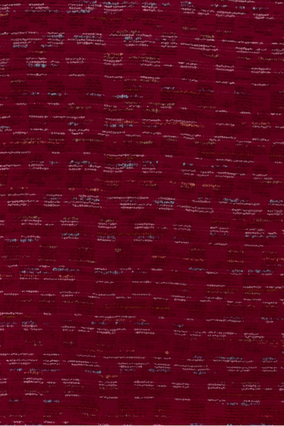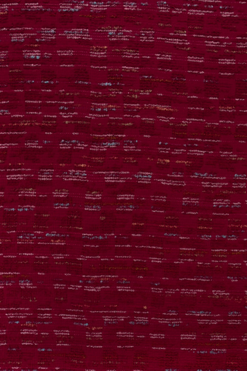 Jacquard intrecciato da miscele di fibre-viscosa, lana e poliestere, colore rosso ciliegia con fili colorati intrecciati. Una proposta interessante per cucire giacche, abiti o cardigan.