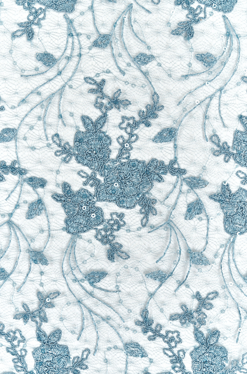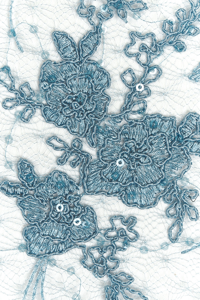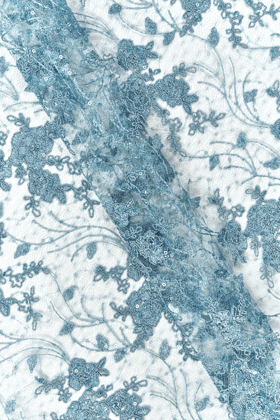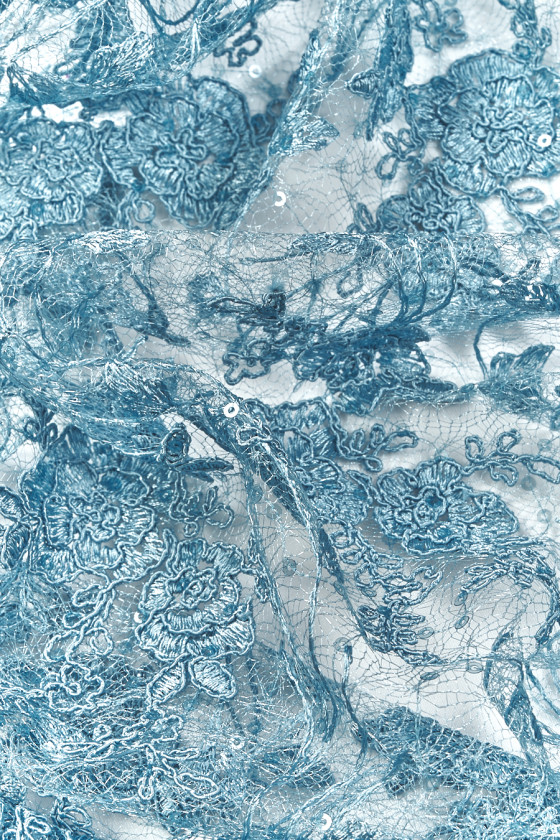 Pizzo italiano in blu e grigio con un fitto motivo floreale, sottilmente decorato con piccole paillettes che fanno brillare il bellissimo luccichio. Il tessuto è realizzato in rete, che assomiglia a una ragnatela, rifinito su entrambi i lati con un dente decorativo: lo cuciamo circonferenzialmente.