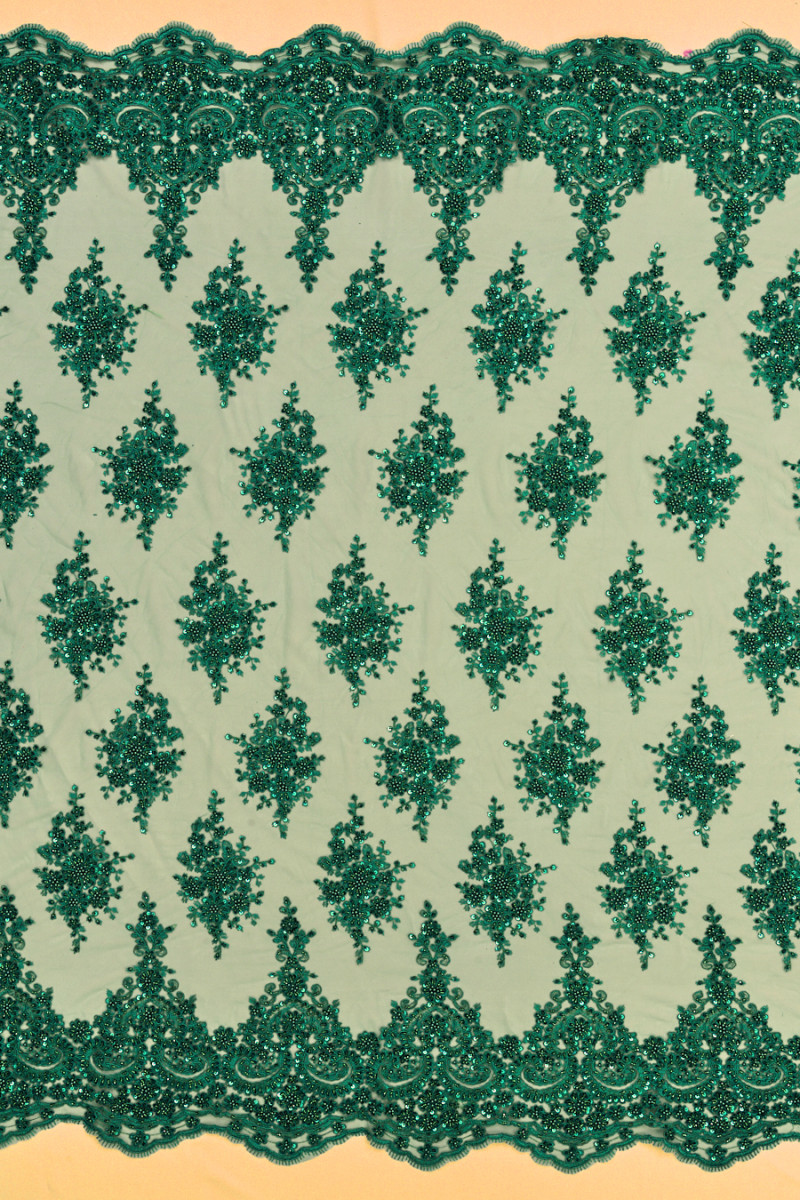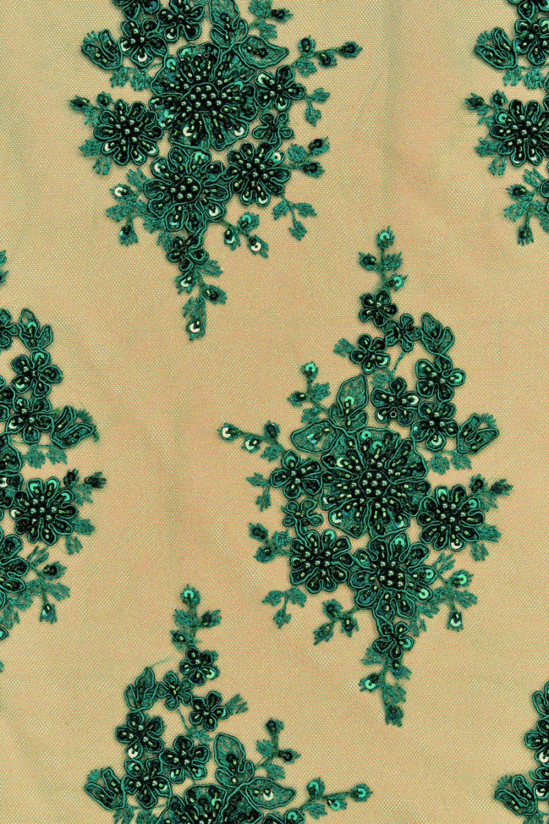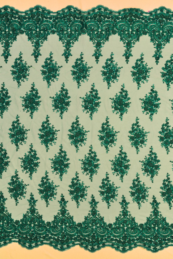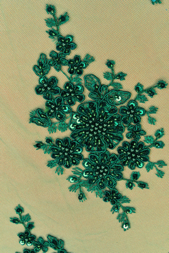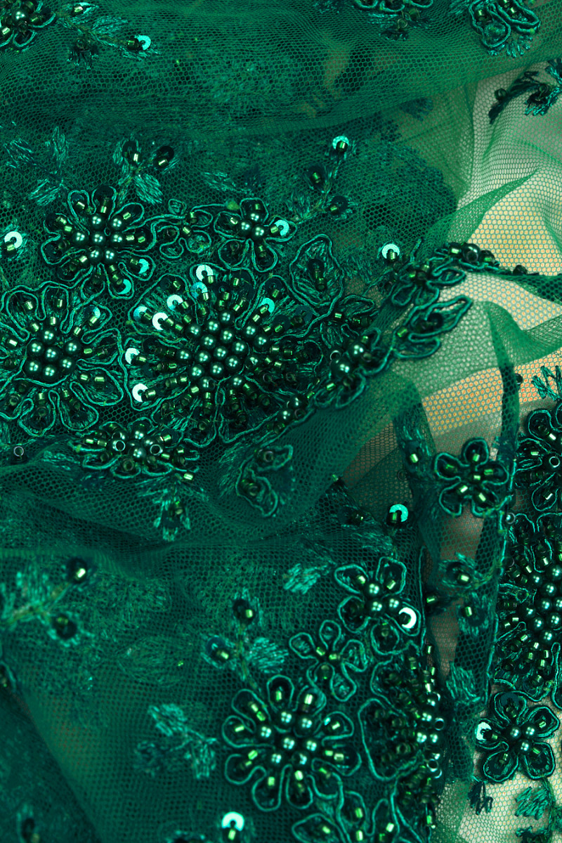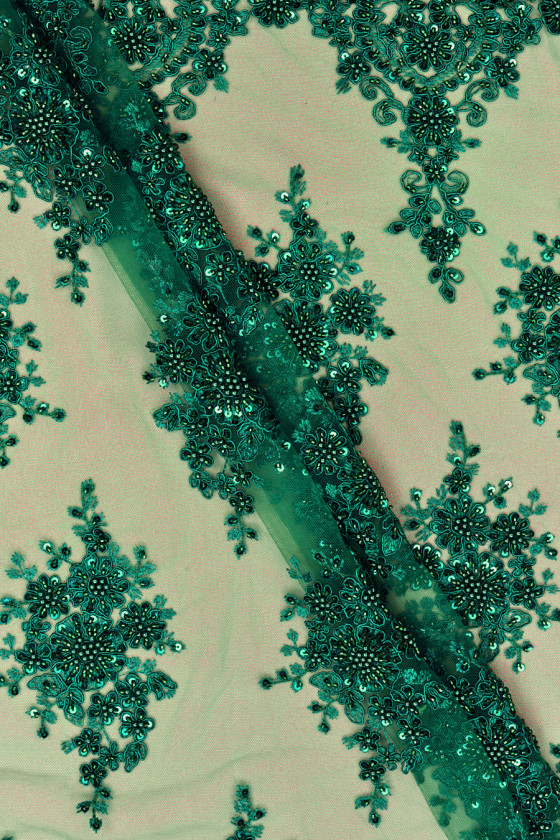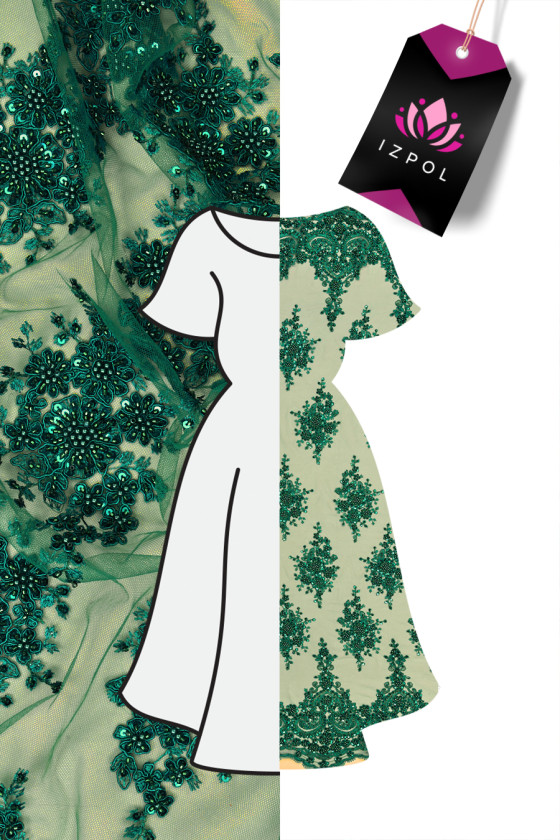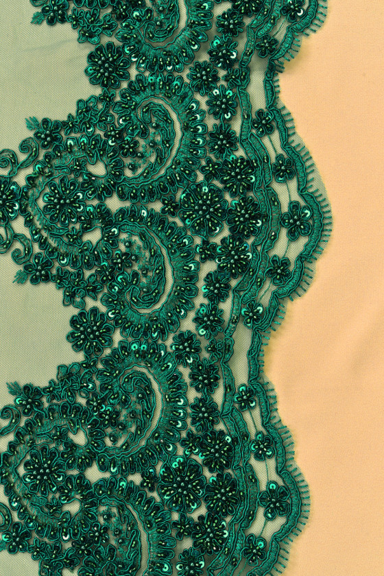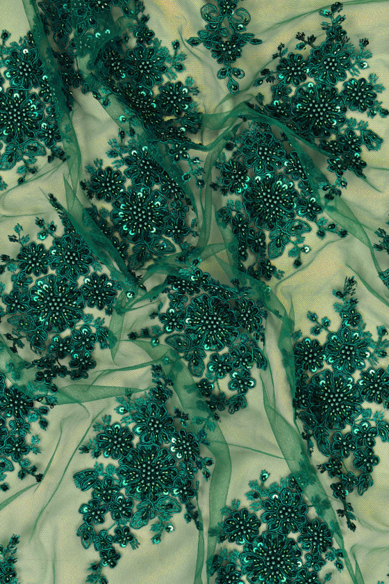 Tessuto da sera in pizzo italiano di colore verde scuro, realizzato in tulle dello stesso colore con motivi floreali uniformemente ricamati di dimensioni 10 cm*20 cm. È riccamente decorato con paillettes verdi, perline e perle e rifinito con un filo verde che rende il motivo leggermente convesso. I bordi del tessuto sono rifiniti con un ampio dente decorativo: lo cuciamo circonferenzialmente.