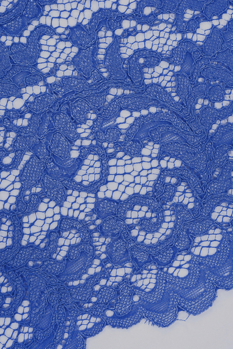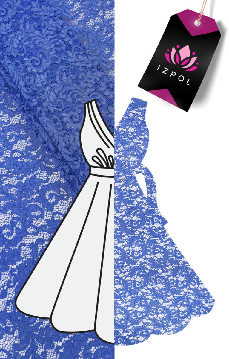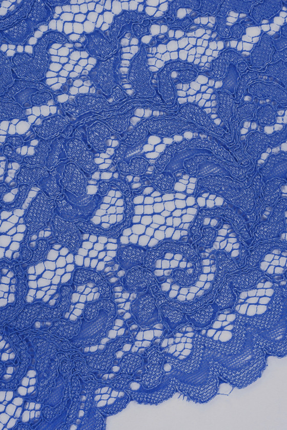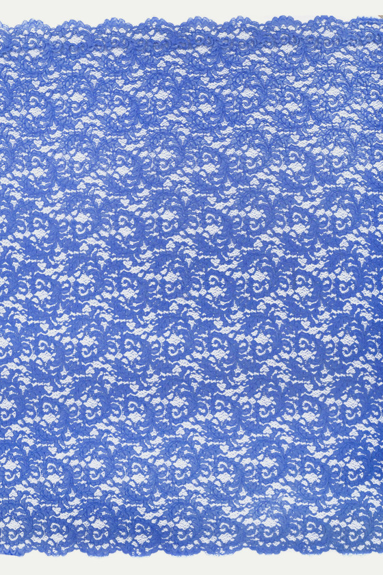 Pizzo italiano in colore blu denim. Il tessuto ha un fitto motivo floreale collegato con una rete e rifinito con un cordino. La corona è rifinita con un dente decorativo su entrambi i lati: la cuciamo circonferenzialmente. Una proposta molto bella per le persone che amano i colori classici e neutri.