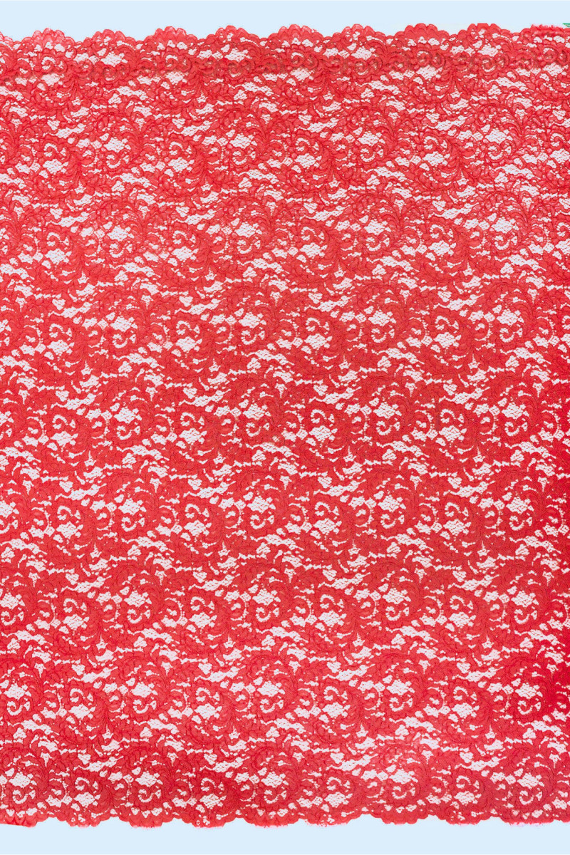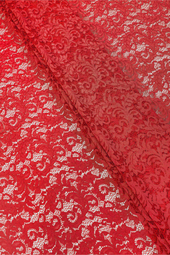 Pizzo italiano in rosso. Il tessuto ha un fitto motivo floreale collegato con una rete e rifinito con un cordoncino. La corona è rifinita su entrambi i lati con un dente decorativo: la cuciamo circonferenzialmente. Una proposta molto carina per le persone che amano i colori classici e forti.
