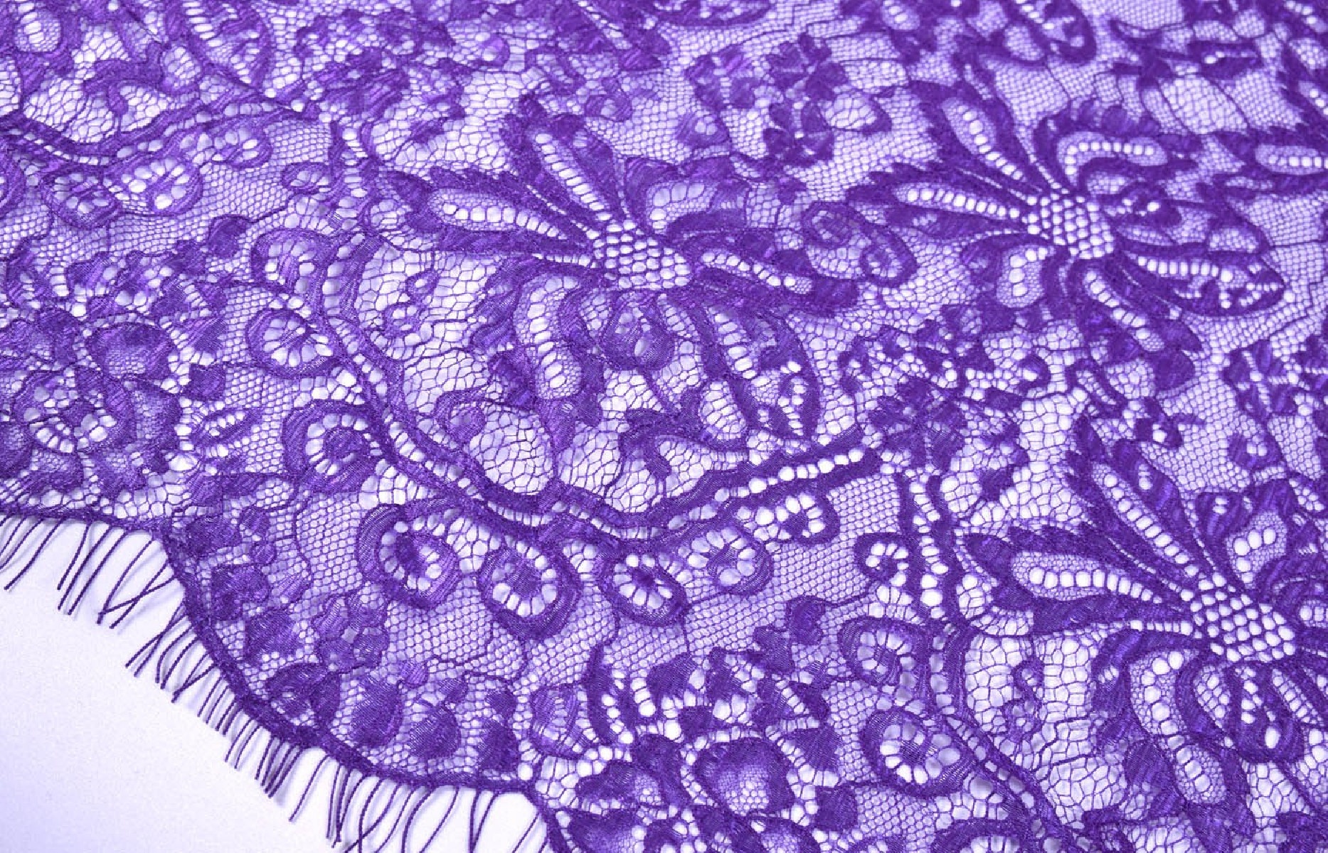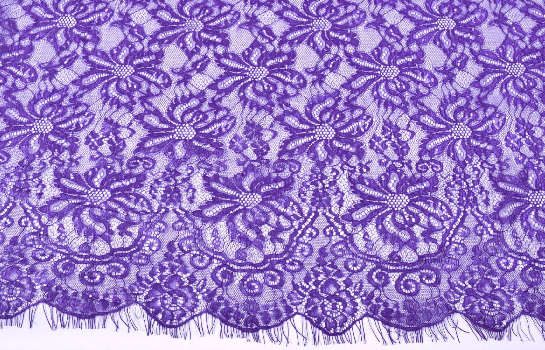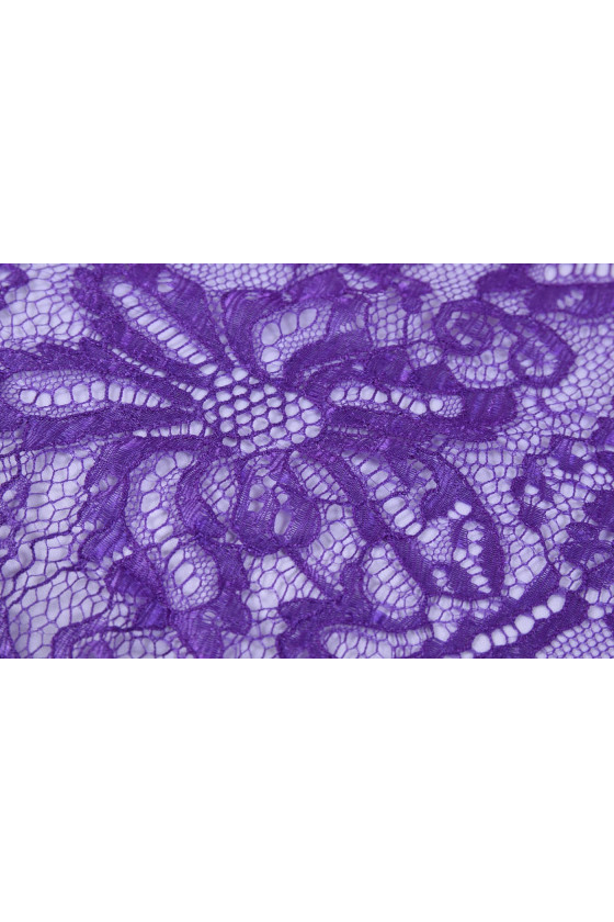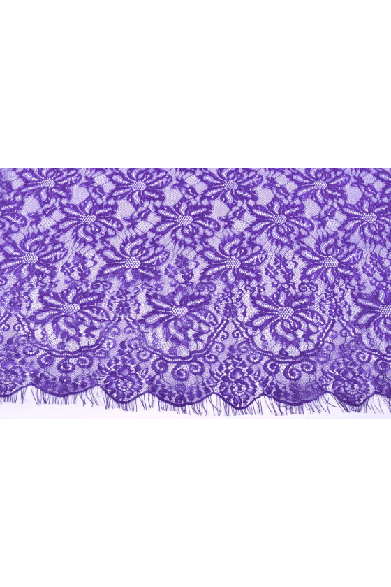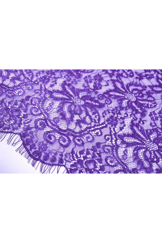 Pizzo da sera in viola, si presenta in un coupon ripetibile con dimensioni di 110 cm * 150 cm. Rifinito su un lato con un dente, anelastico.