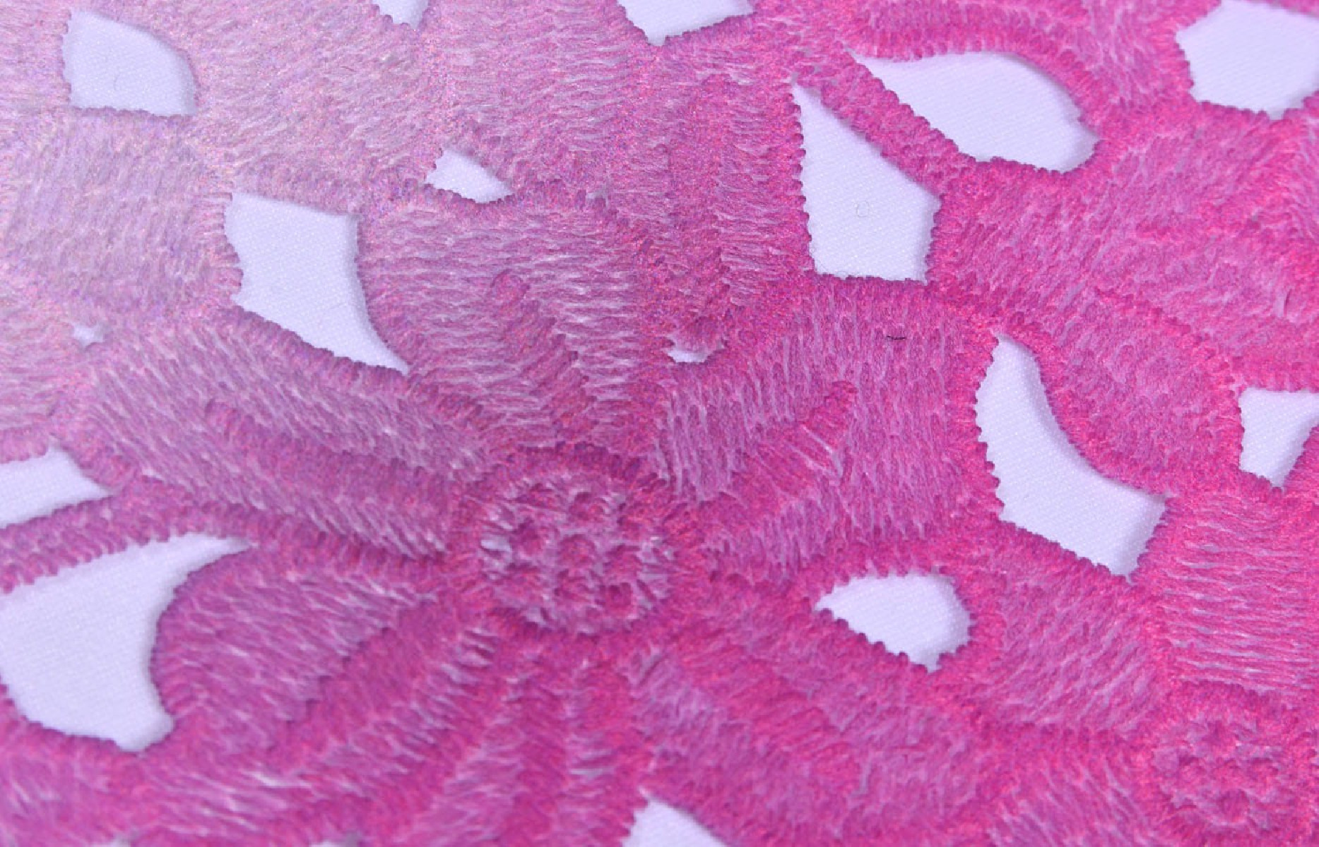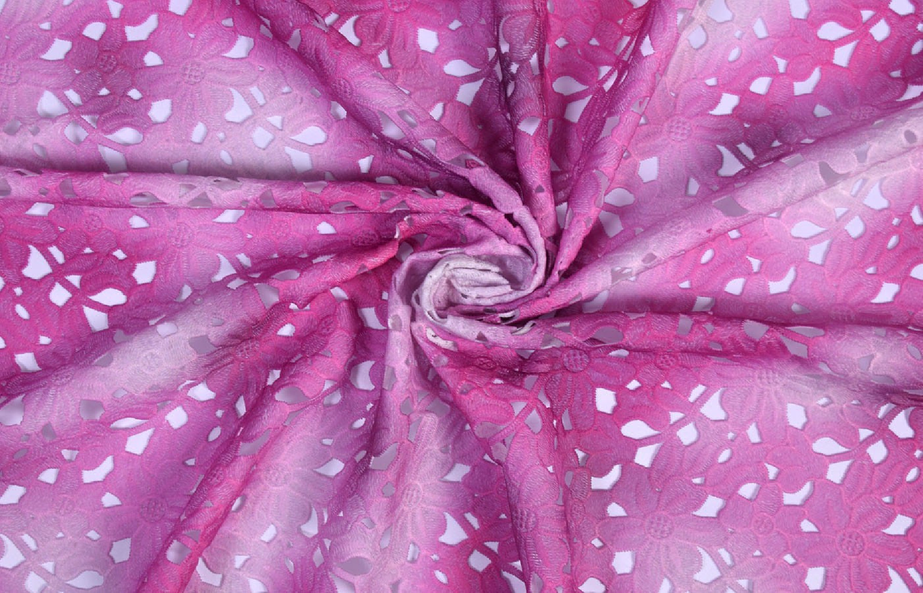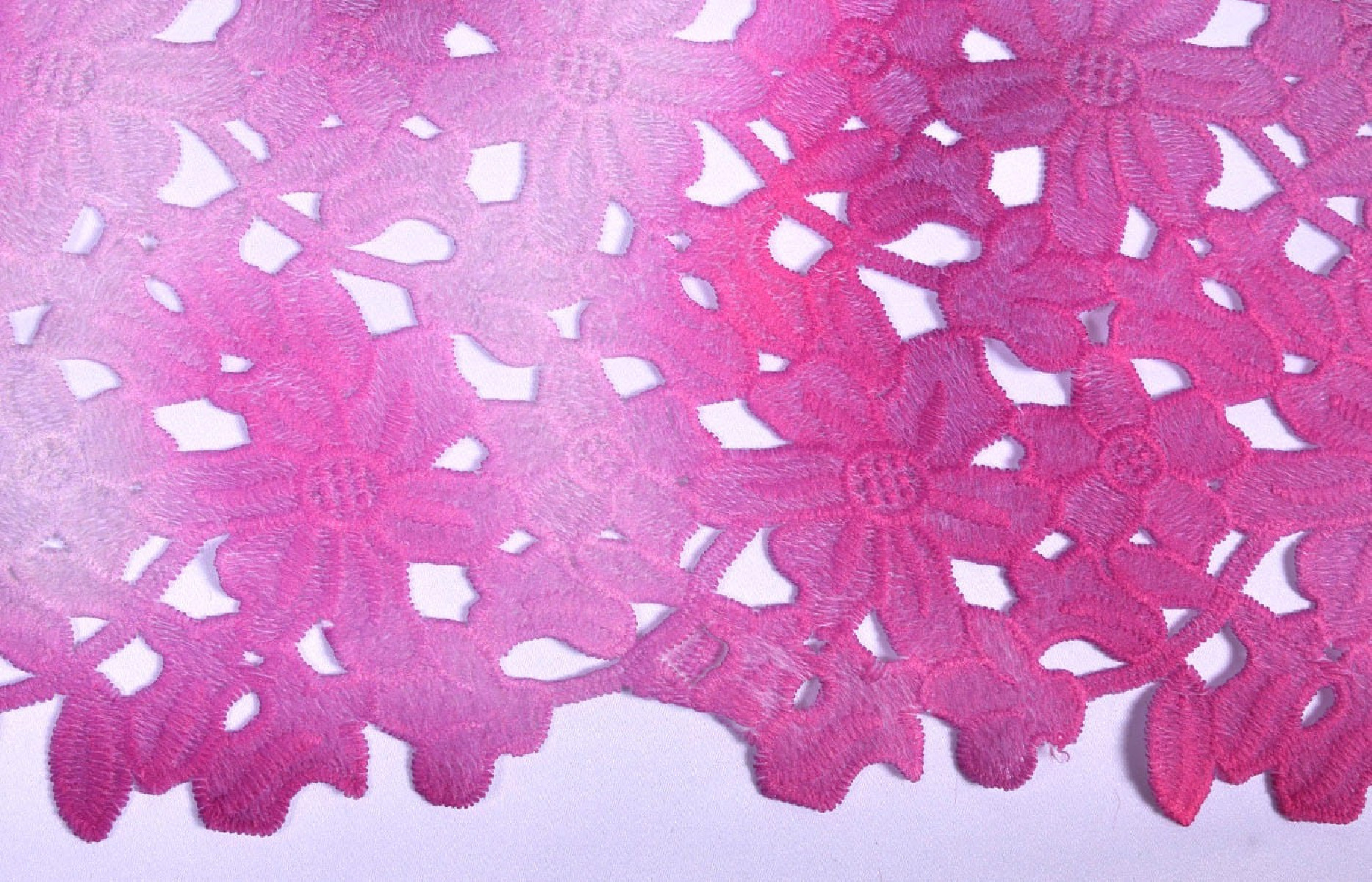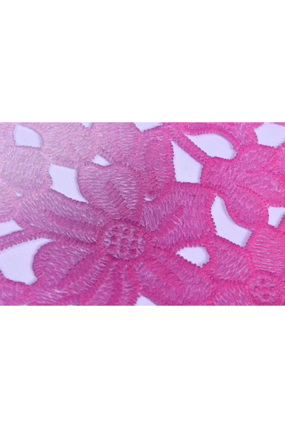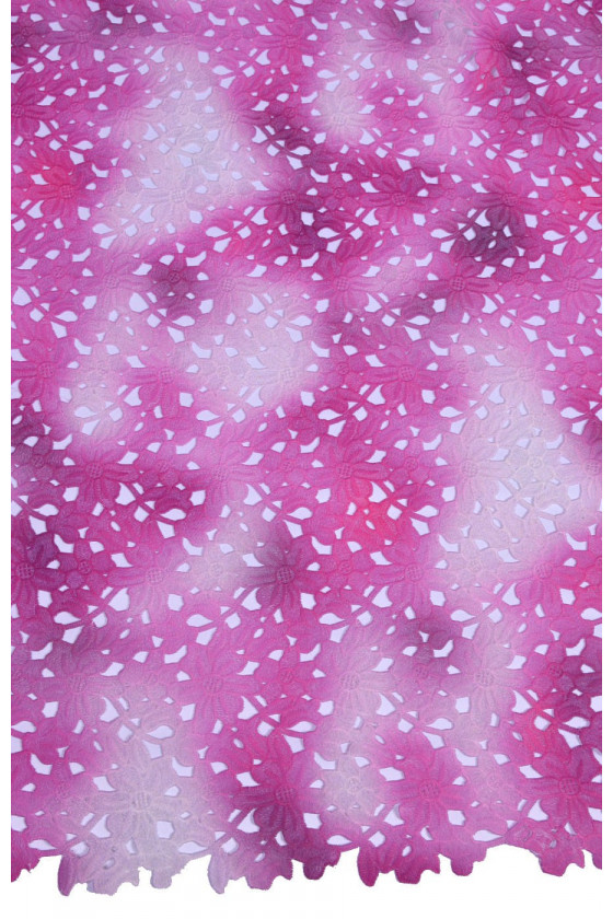 Tessuto italiano guipure in rosa e bianco - in un coupon di 160 cm* 125 cm. Un motivo bello e denso con sfumature originali, il tessuto su due lati è rifinito con un dente sottile e decorativo. Il tessuto è perfetto per le persone a cui piacciono i colori originali. È perfetto per cucire un vestito elegante, una camicetta, una gonna o come finitura ad altri tessuti.
