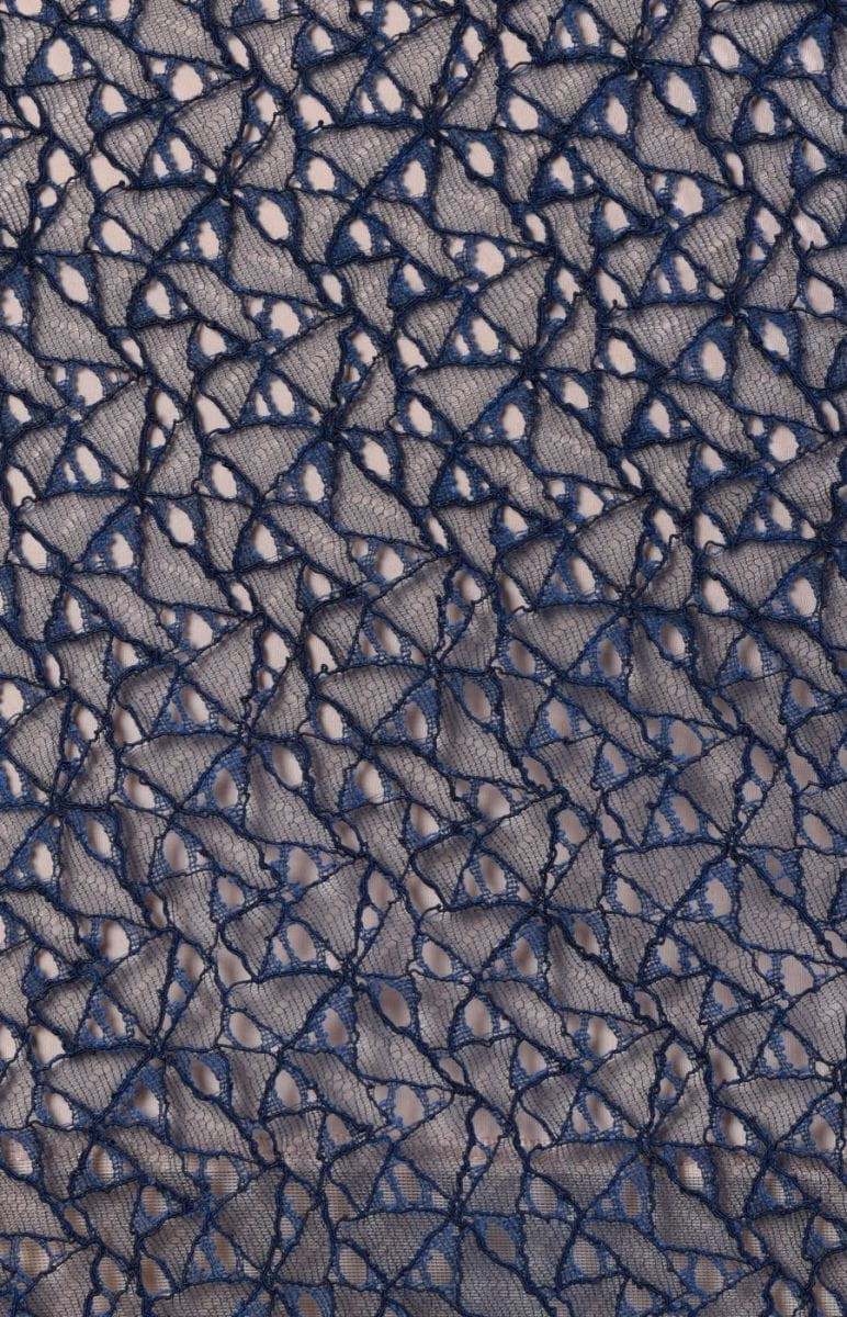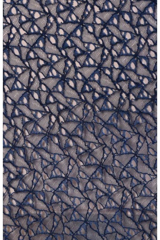 Tessuto di pizzo italiano in blu navy in formato coupon 50cm*90cm. Il motivo delicato e denso che ricorda i fiori è stato tagliato con una corda. Il tessuto su entrambi i lati è rifinito con un dente decorativo. Una proposta molto originale per cucire una camicetta o una gonna per le persone a cui piacciono i modelli originali.