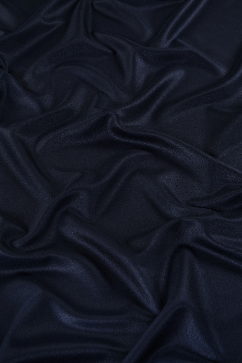 Costume italiano in lana blu navy con un'interessante e fine trama jacquard. Tessuto morbido, più sottile, non elastico con una bella lucentezza - perfetto per cucire un costume, un abito, un pantalone, una gonna, un vestito.
