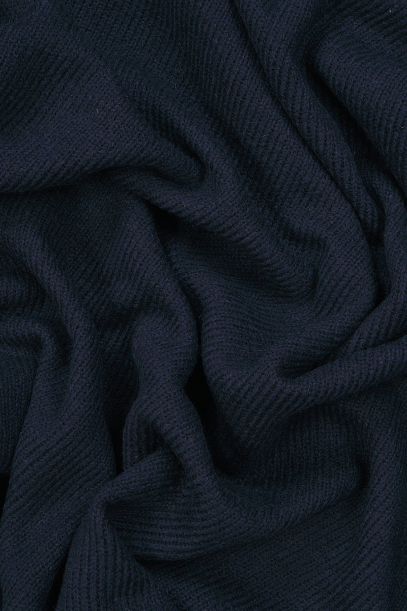 Italiano, maglione spesso in lana di colore blu navy scuro. Un tessuto "doppio" con una trama a coste da un lato (0,5 cm) e una liscia dall'altro, simile alla lana cotta a vapore. Tessuto leggermente elastico e carnoso, perfetto per cucire un maglione, una giacca o un cappotto