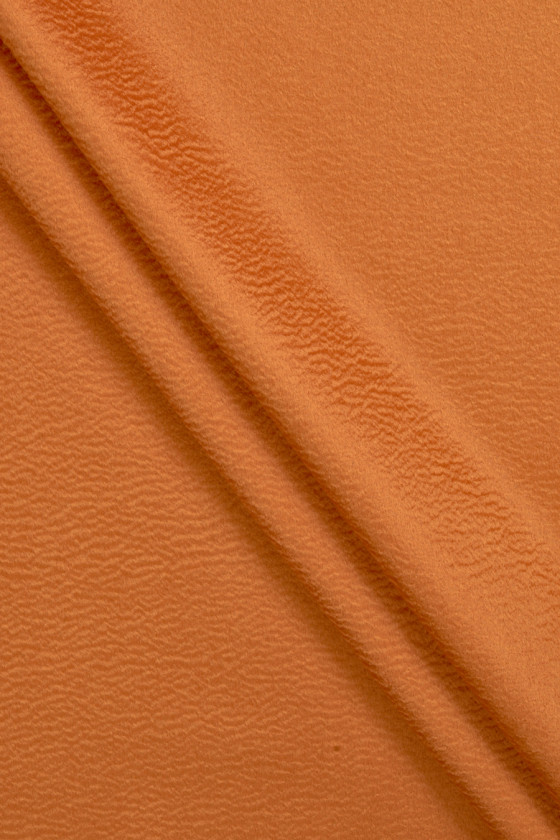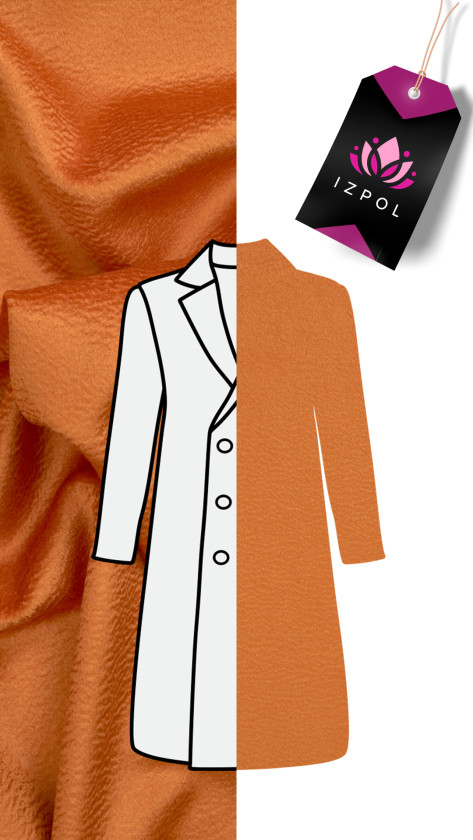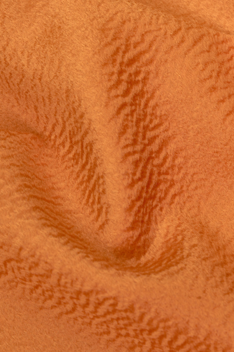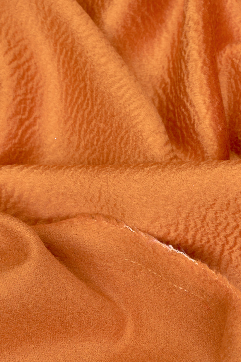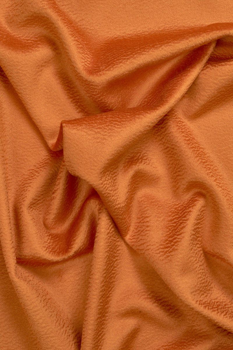 Lana vergine italiana con un misto cashmere arancione con una struttura ondulata che crea un aspetto tridimensionale del tessuto, noto come effetto Zibellino. Un tessuto molto morbido, nobile e dalla lucentezza delicata è perfetto per cucire un cappotto, una giacca o un gilet caldo autunno-inverno. La migliore composizione di qualità rende il tessuto non solo bello, ma anche molto caldo. Il tessuto è perfetto per le persone che amano i classici in edizione più alta.