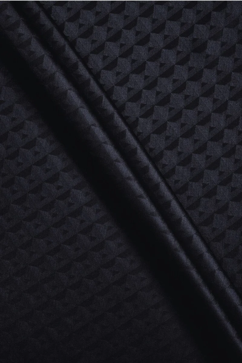 Tessuto italiano 100% lana con tessuto giacquard raffigurante diamanti. Il tessuto è tessuto con due colori di fili - blu scuro e nero, creando un effetto bicolore e un interessante effetto tridimensionale. Il motivo è denso e regolare - un singolo pezzo misura 2 cm * 2 cm. Il materiale è sottile ma opaco, rigido, morbido, leggero e piuttosto fluido. È rifinita con una lucentezza elegante. Lo consigliamo principalmente per abiti, gonne e pantaloni più larghi.