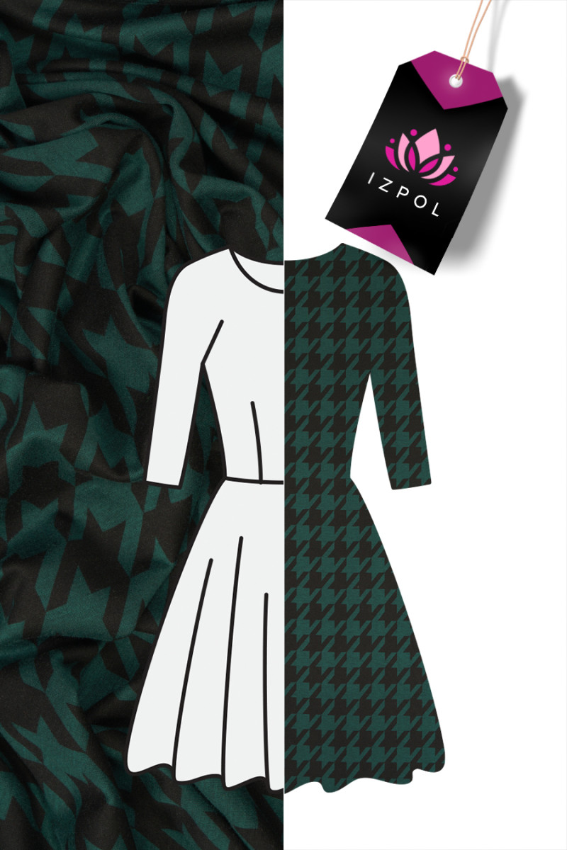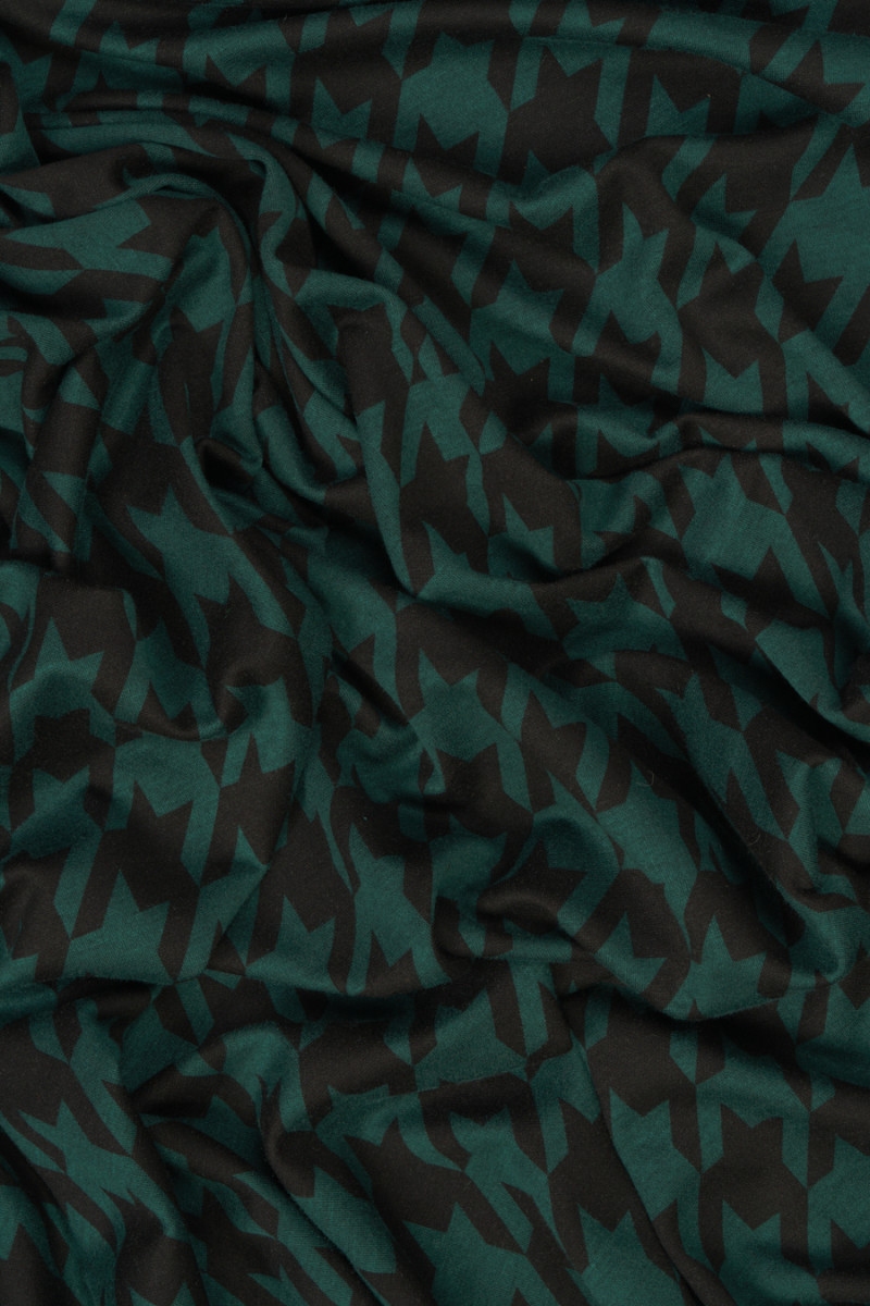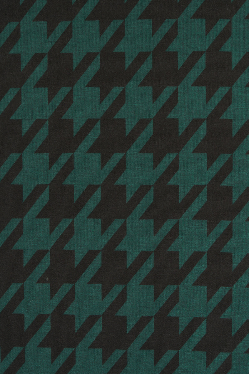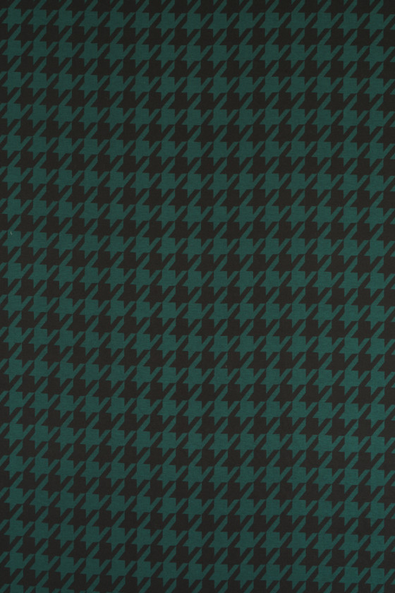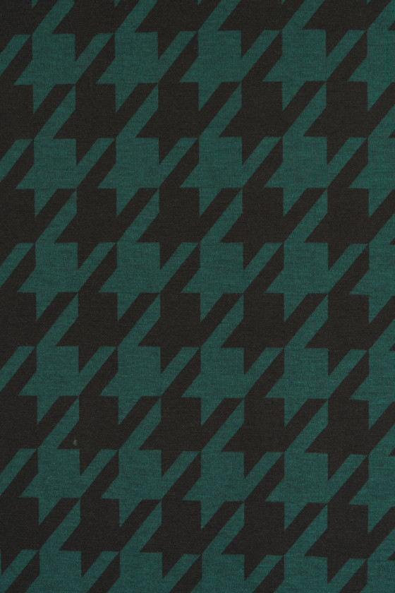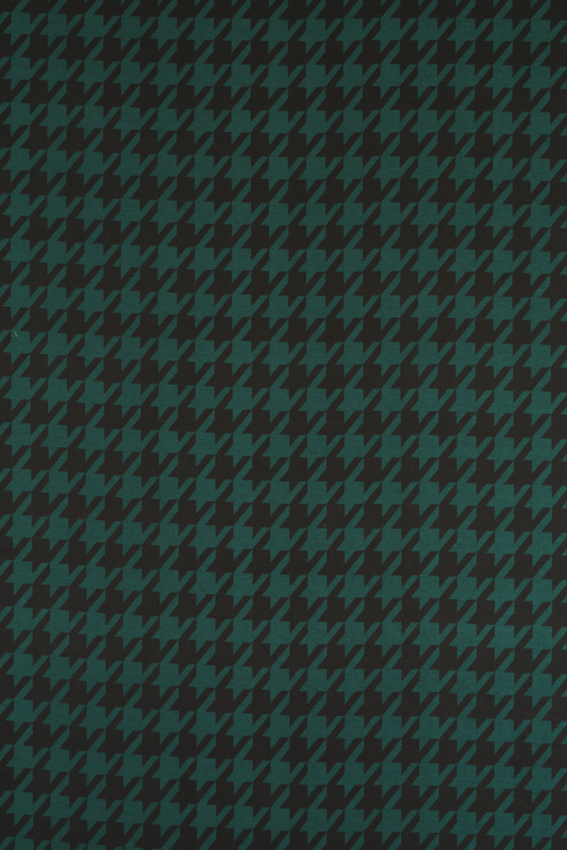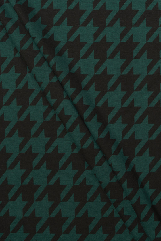Tessuto a maglia jersey italiano con motivo a zampa di gallina grande (7 cm) nei colori verde bottiglia e nero. Il tessuto a maglia jersey è un tessuto di copertura a trama fitta, elastico, morbidamente drappeggiato, che può essere cucito sfoderato.