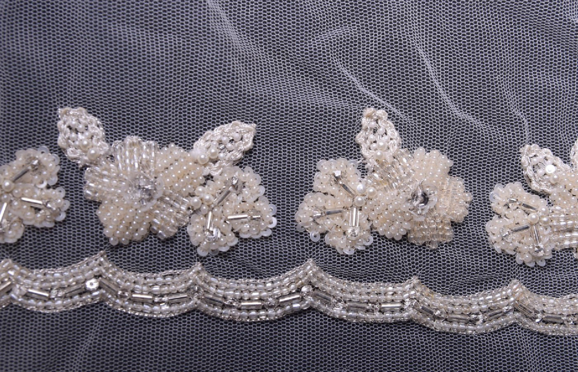 Nastro di perline splendidamente decorato. Si adatta perfettamente alla finitura di abiti da sposa e da cerimonia. La larghezza del tulle è di circa 30 cm, la larghezza delle perline è di circa 5 cm