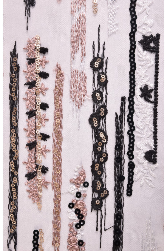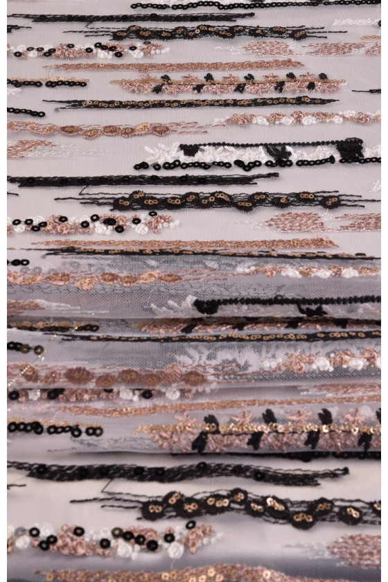 Tulle bianco ricamato con filo nero, bianco e salmone. Piccole paillettes sono cucite sul ricamo. Il tulle si allunga in una direzione. Un tessuto molto suggestivo, che può essere utilizzato per cucire originali outfit formali.
